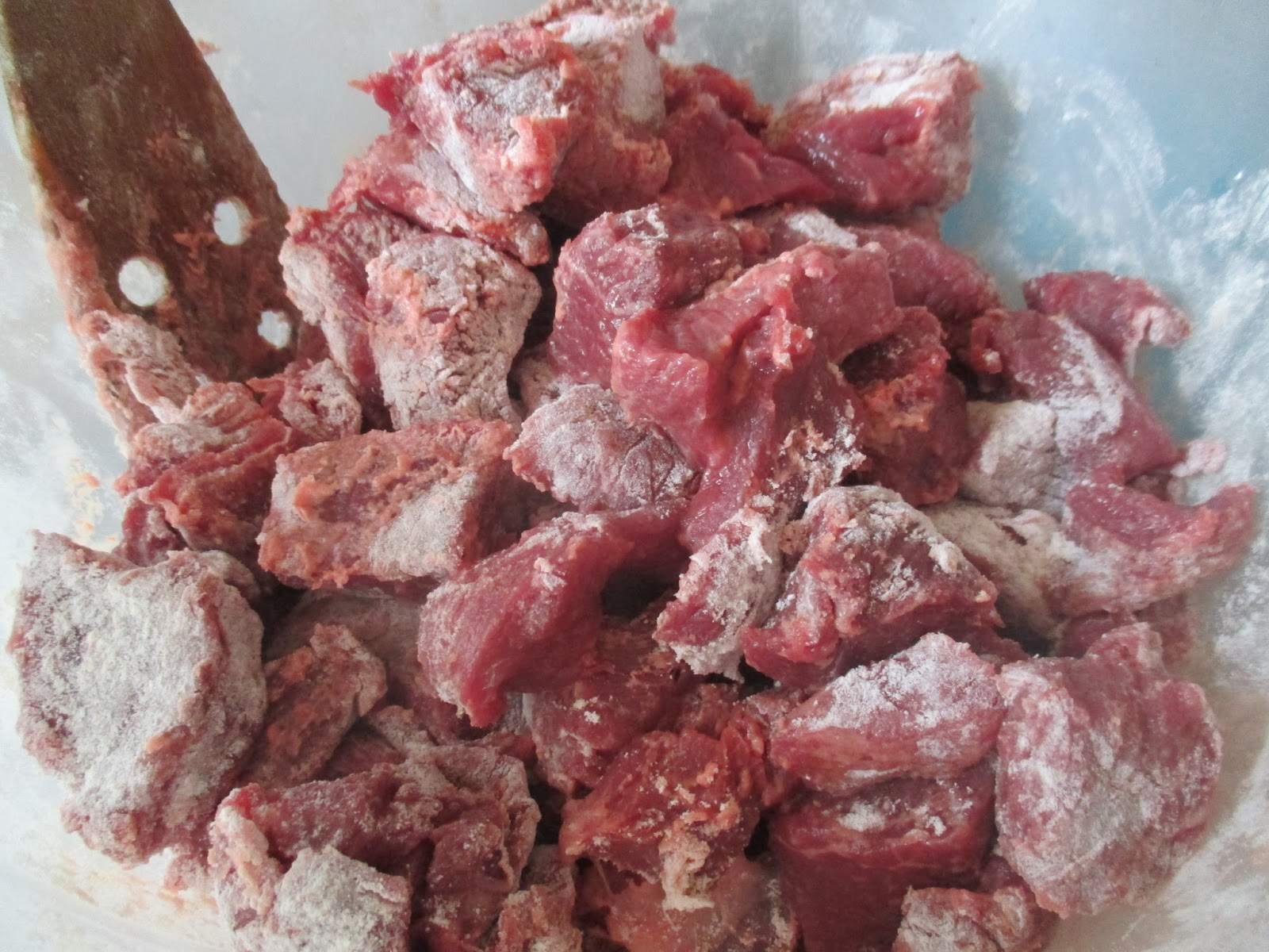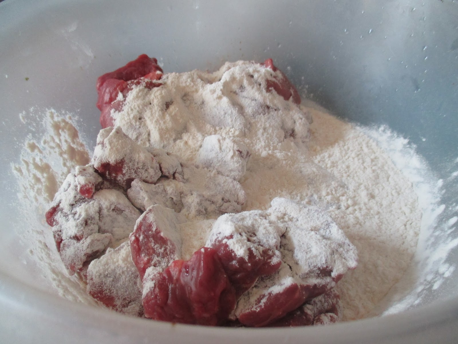 Das Fleisch wird vor dem Anbraten mehliert. Das hat den Vorteil, dass es schneller anbrät und vor allem hat die Soße später mehr Bindung, sprich man muss die Soße später nicht mehr extra andicken.