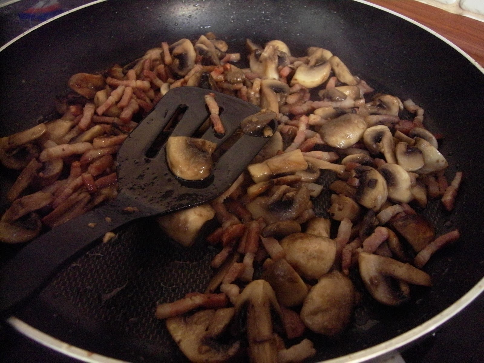 Bacon und Champignons in der Pfanne anbraten und wenn beide Zutaten eine gesunde Gesichtsfarbe haben und Röstaromen bilden, kommen sie zum Rest in den Topf.