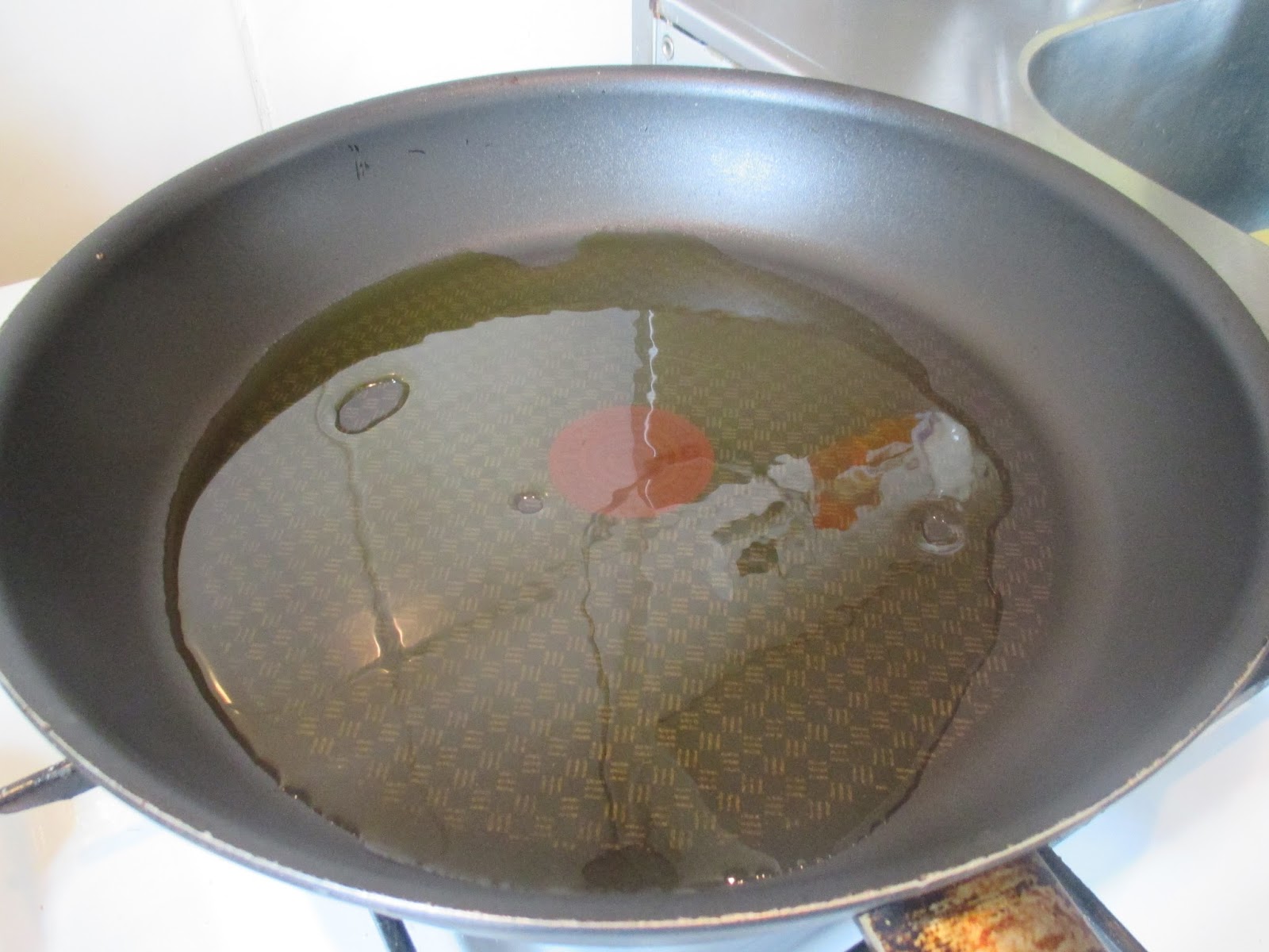 Normal teste ich das mit meinem Pfannenwender aus Holz. ob das Fett heiß ist, aber ich wollte mal etwas Anderes zeigen. Deswegen habe ich das Fett erst heiß werden lassen und dann ein Probestück Fleisch in die Pfanne geworfen. Wenn da richtig die Blasen im Fett aufsteigen, hat es die richtige Temperatur und man kann mehr Fleisch zum Anbraten in die Pfanne legen.