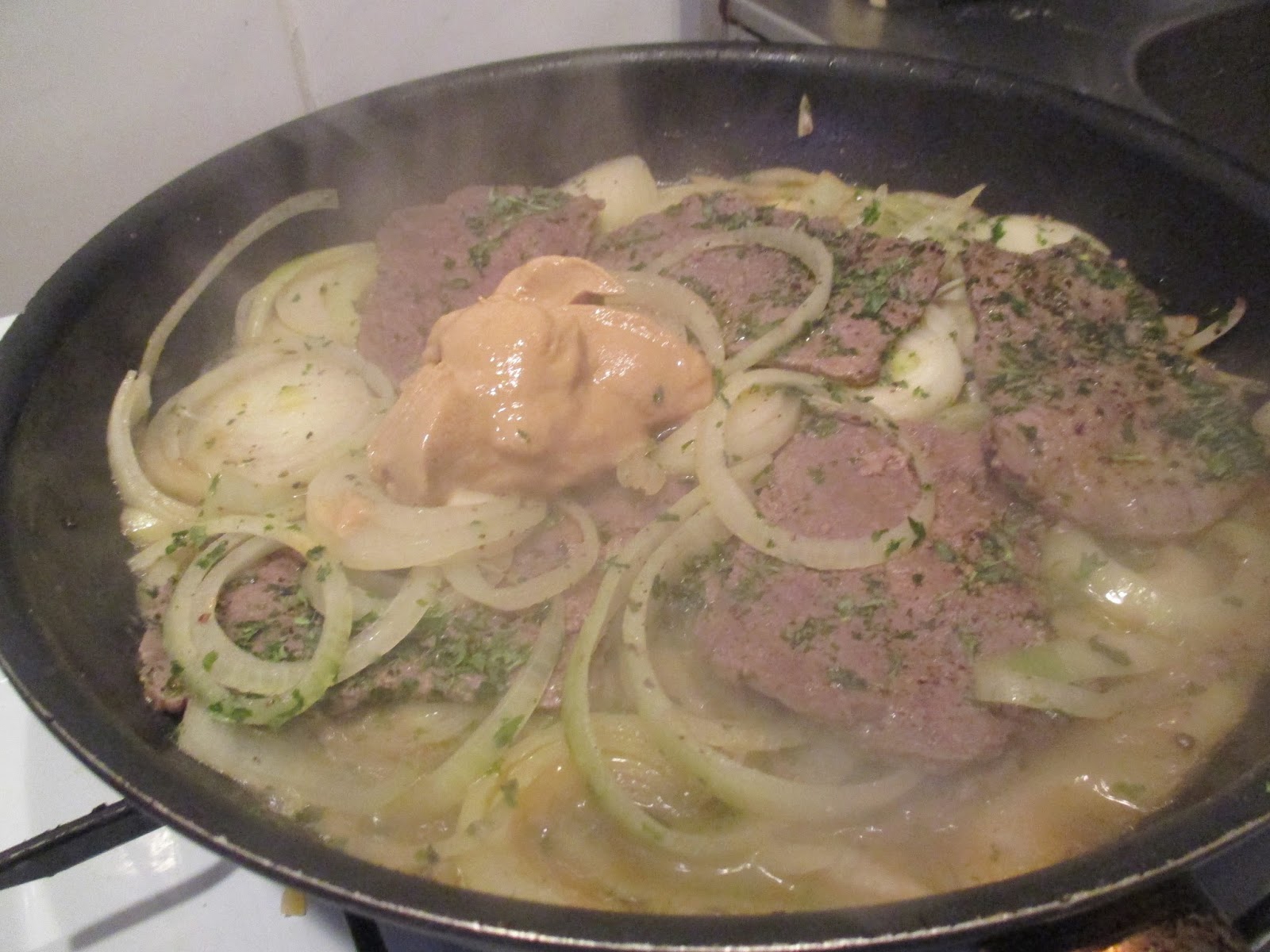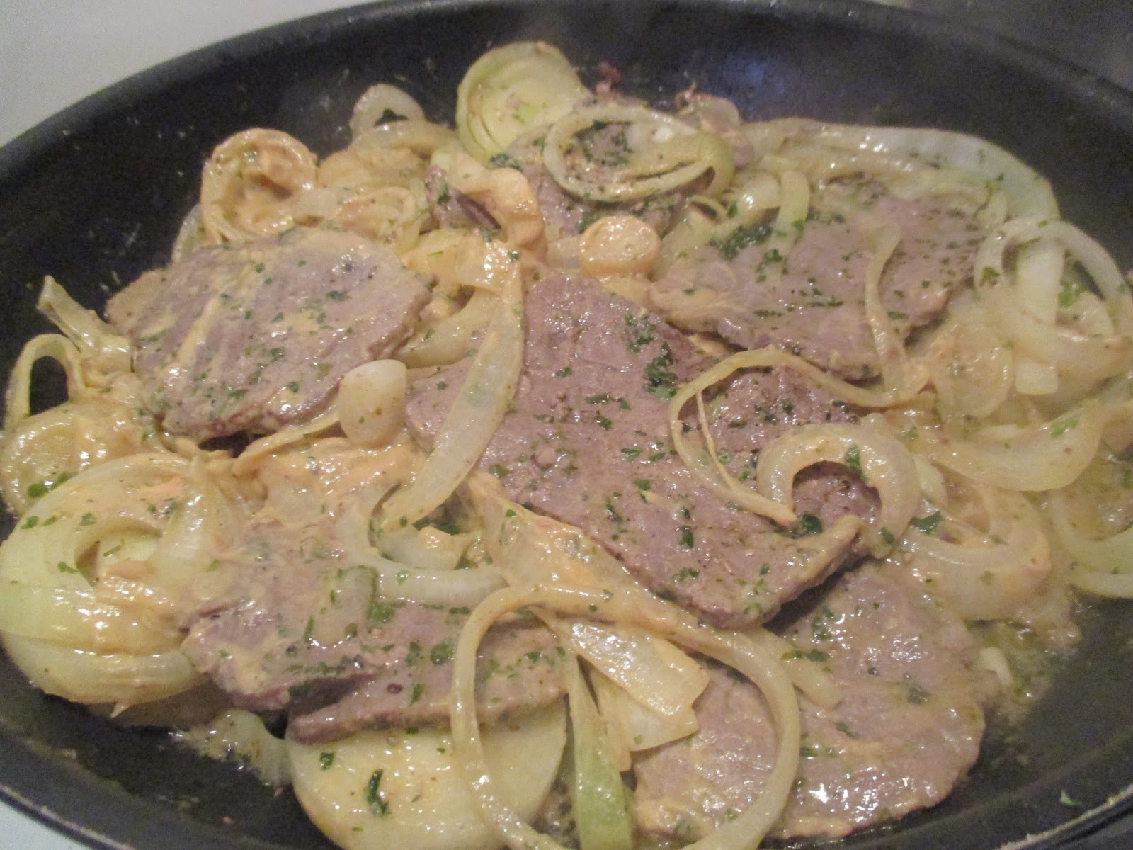 Hier fehlt mir irgendwie ein Bild in der Reihe. Zuerst das Fleisch von beiden Seiten anbraten und dann nach zwei Minuten die Zwiebeln in die Pfanne geben. Mit Petersilie bestreuen.