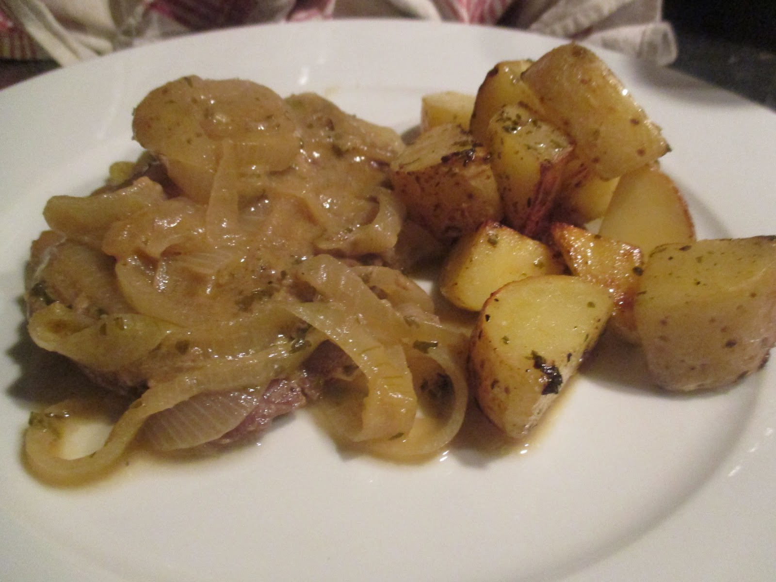 Minutensteaks, was für ein Name nach 90 Minuten, auf den Teller legen und Zwiebeln samt Soße darüber geben.