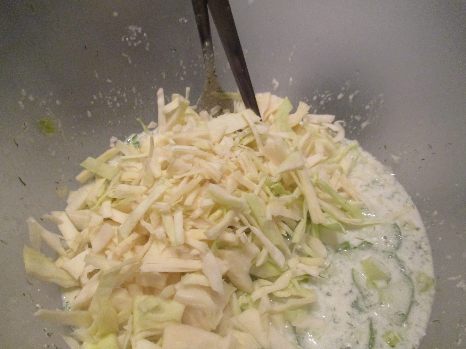 Jetzt kommen die Zutanten in den Salat die ich nicht marinieren lasse, z.B. Weißkraut.