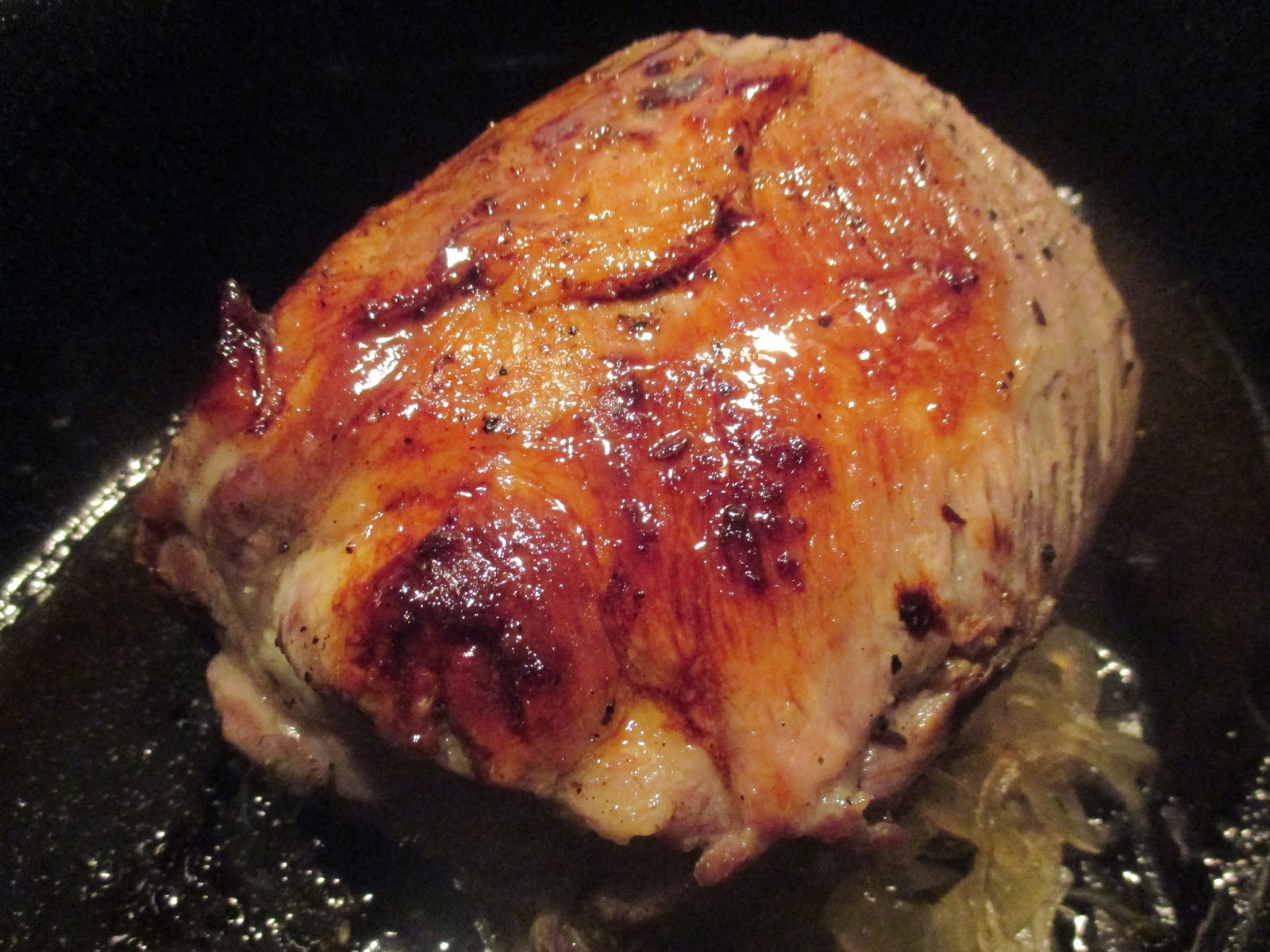 Um das Fleisch herum, hat sich die Zwiebelmarmelade mit dem austretenden Fett und Fleischsaft vermischt
