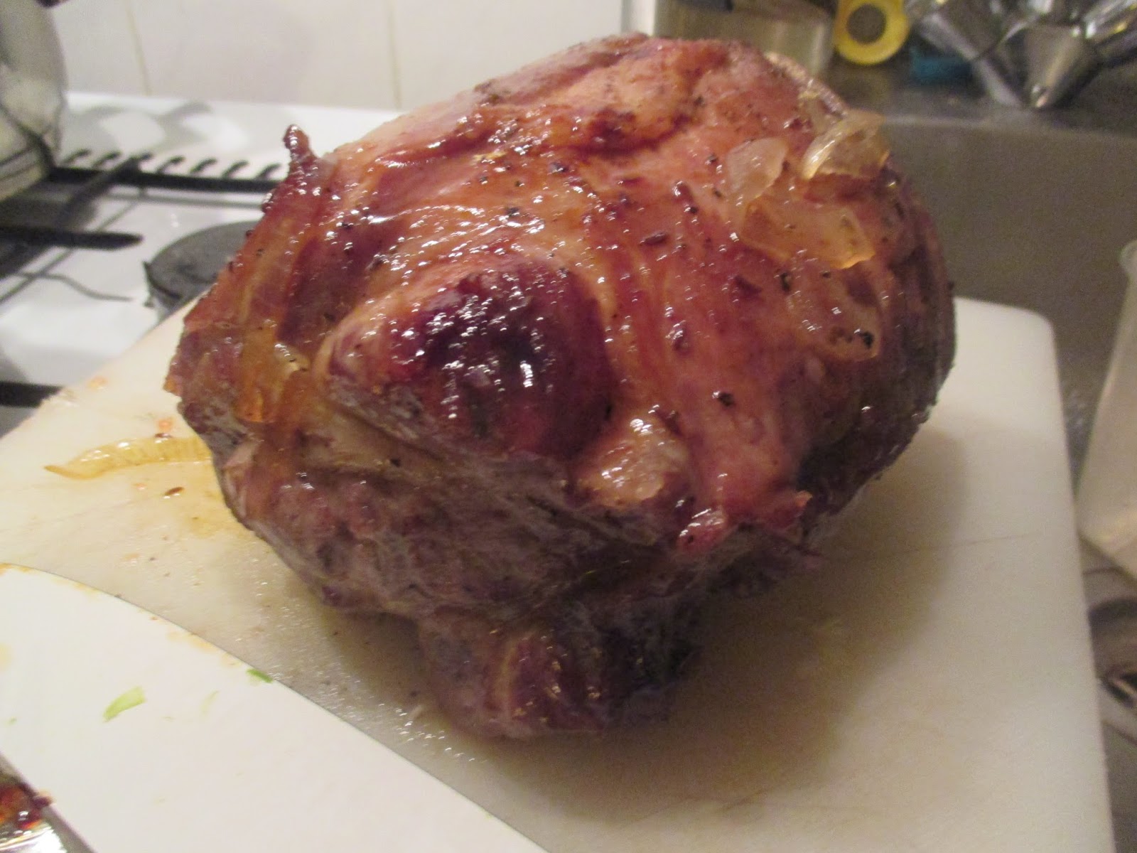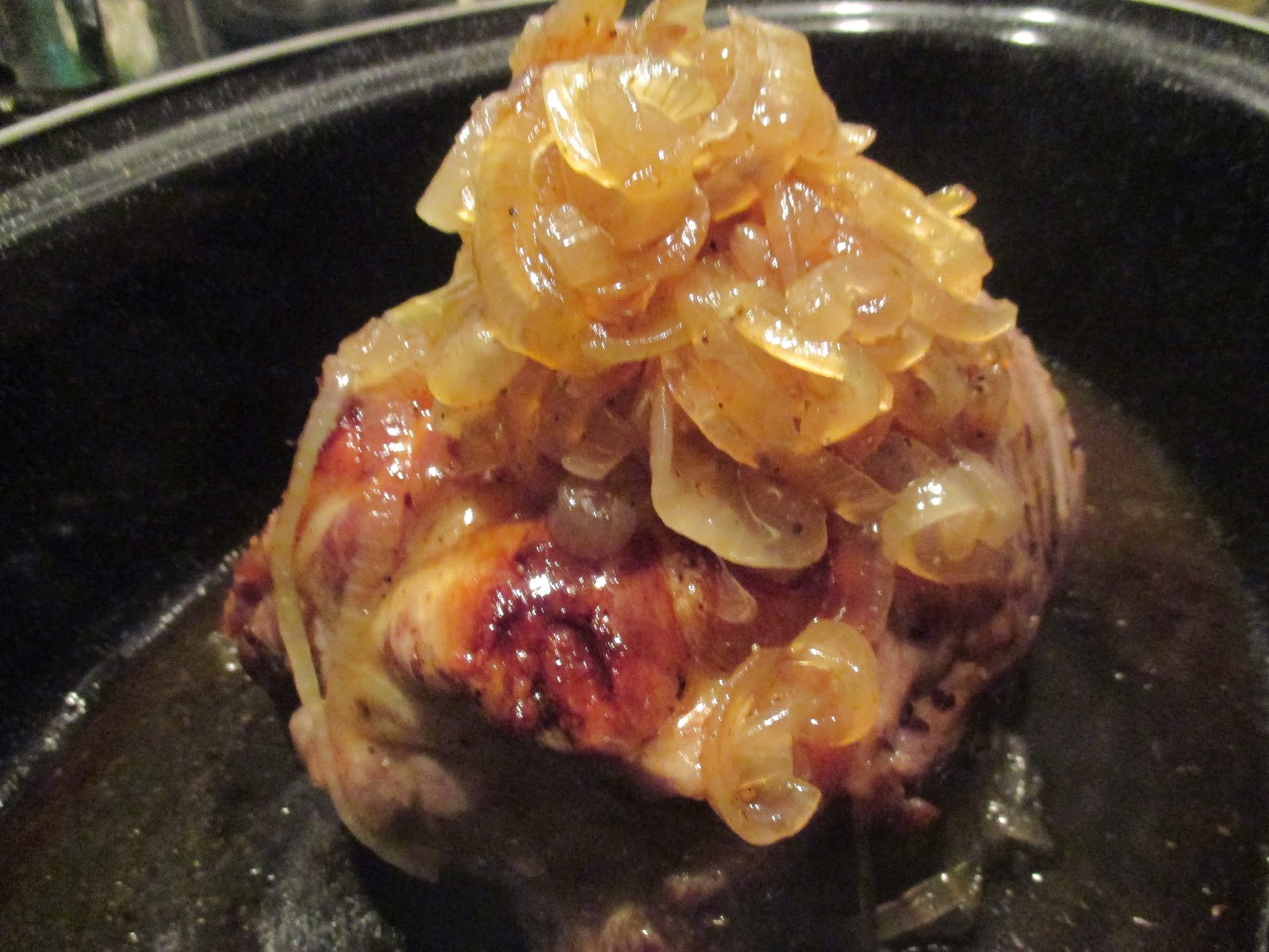 Jetzt die Zwiebeln und den Rest der Zwiebelmarmelade über den Braten legen. Wenn sich irgendwas am Bräterboden abgesetzt hat, mit ein bisschen Flüssigkeit ablösen. Nun kommt der Braten offen in den Ofen ohne Abdeckung. Wenn Ihr die 80 Grad vor Ablauf der drei Stunden habt, kann der Braten raus. Mein Ofen ist ja eine lahme Sau, deswegen brauche ich drei Stunden, da ich keine Oberhitze habe.
