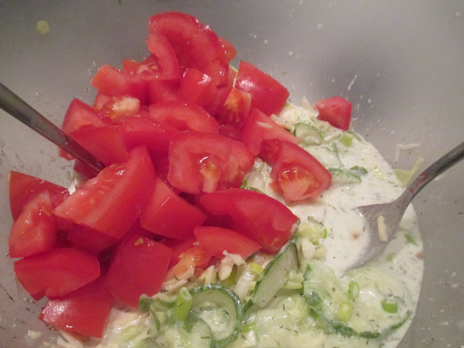 Saure Sahne unter den Salat mischen, Essig und einen Schuss Pflanzenöl dazu geben und den Salat ordentlich vermischen.