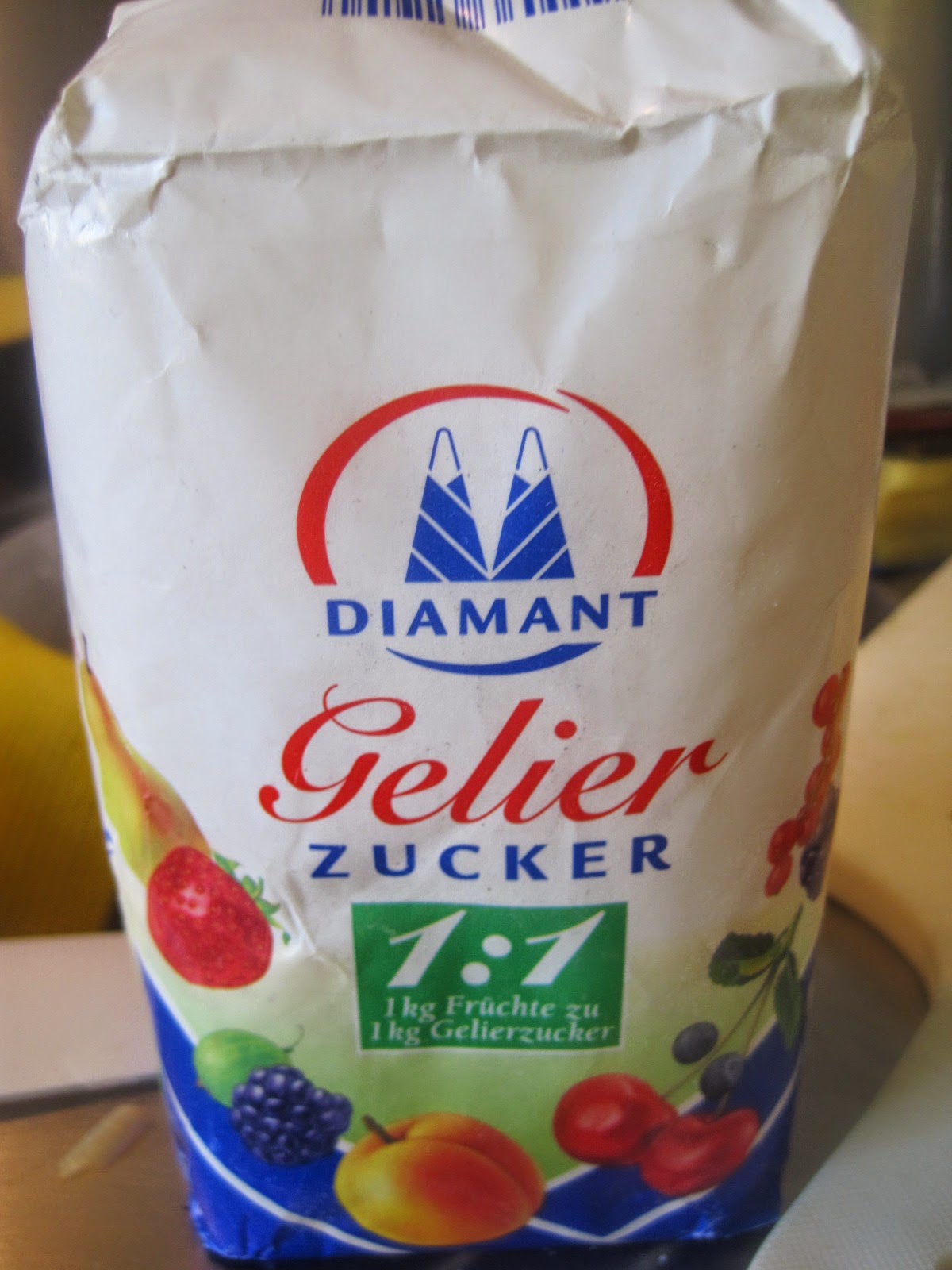 Hier kommt unsere Geheimwaffe, Gelierzucker. Ich hatte noch ein Paket 1 zu 1 das weg musste, aber wenn Ihr das auch zubereiten wollt, dann nehmt einfach 1 zu 2.