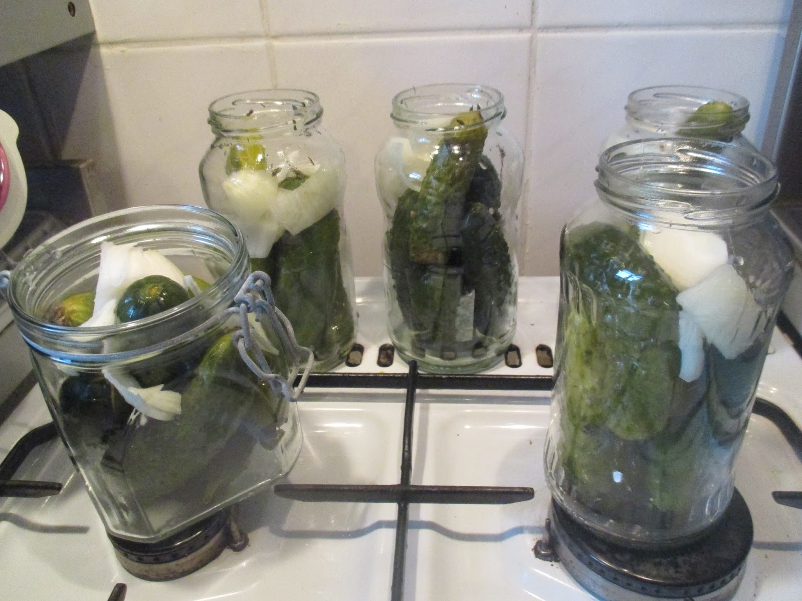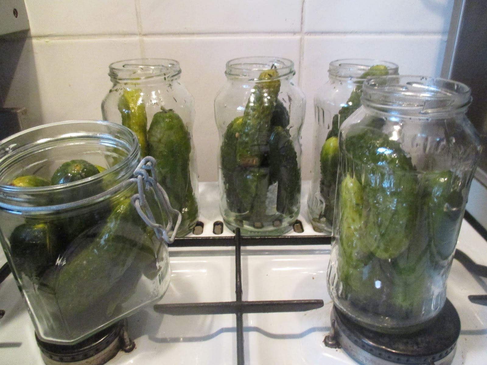 So kann man die Gurken, wenn es draussen nicht gerade 35 Grad hat, ein bis zwei Tage ziehen lassen. Nun geht es ans Einkochen. Die Gläser werden in kochendem Wasser sterilisiert.