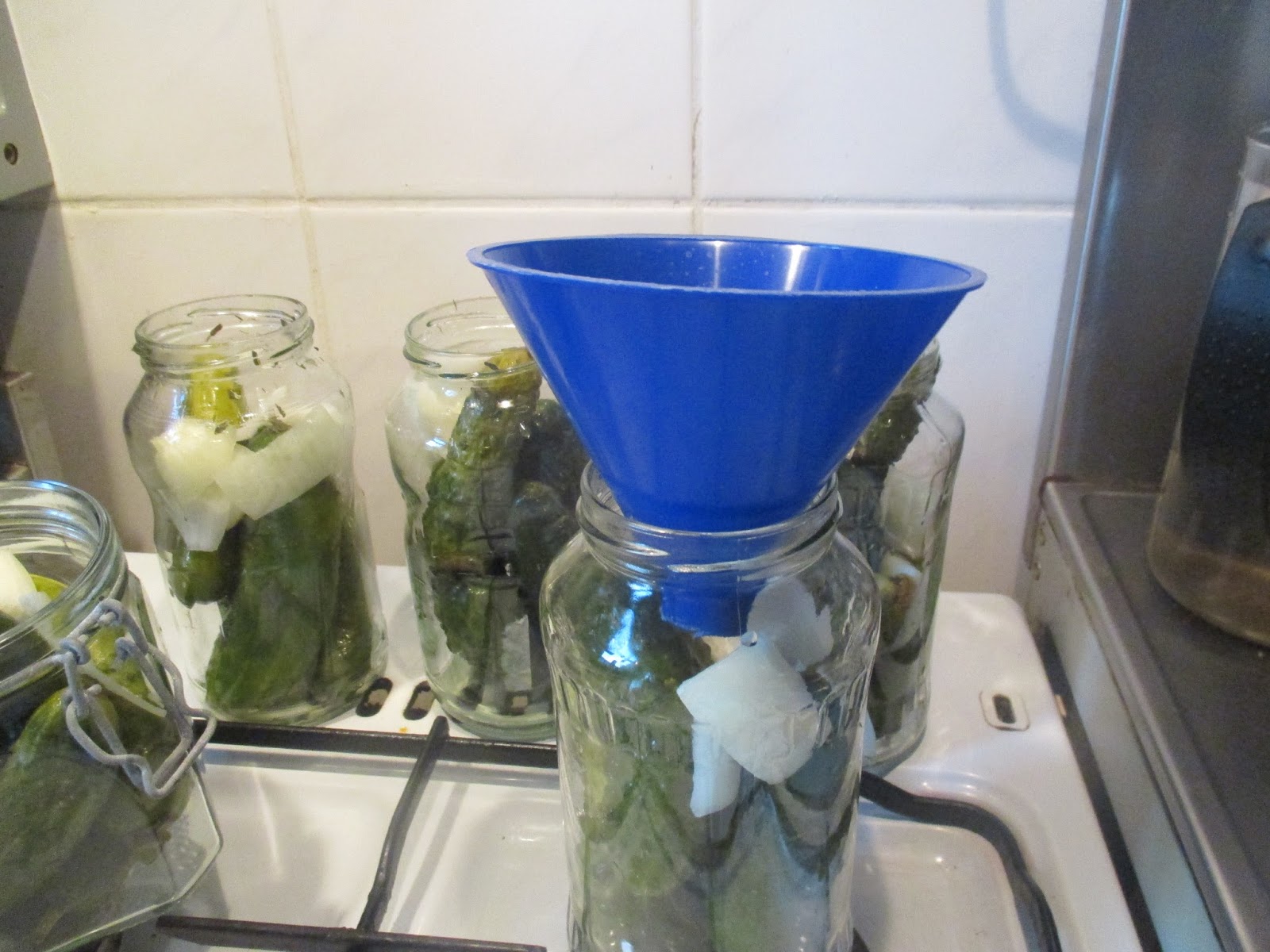 Durch den Trichter, wird die Lake in der die Gurken eingelegt waren, in die Gläser gefüllt.