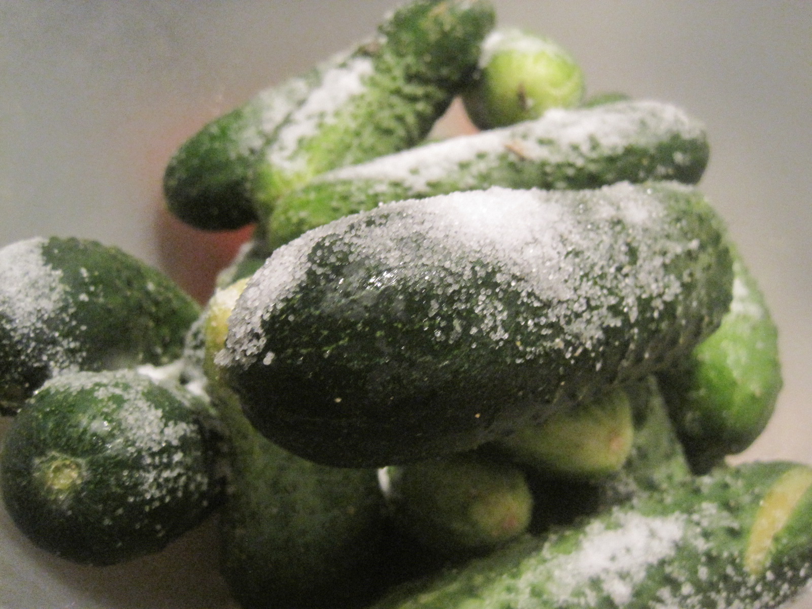 Nach einem Tag umrühren, schauen, ob sich Flüssigkeit abgesetzt hat, die gerne auch mal probieren, wenn es nicht salzig genug ist, noch Salz dazu geben. Jetzt 20 Esslöffel Essig dazu geben. Ich habe nur welchen mit 5 % Säure, besser ist 10 % Säure. Das Schüssel mit Wasser auffüllen, so dass die Gurken bedeckt sind und mit einem Teller beschweren, damit die Gurken gleichmäßig in der Flüssigkeit liegen. Wieder kühl weg stellen. Wer Gurken eher süß-sauer mag, nimmt auch noch ein wenig Zucker.