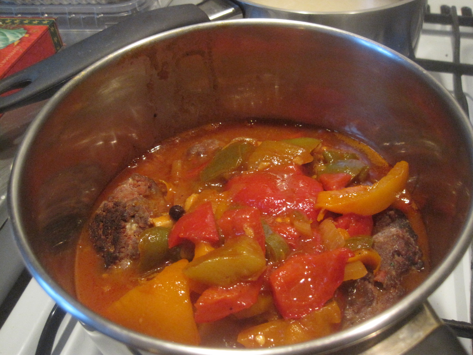 Letscho (auch einen Tag vorher zubereitet). Man könnte sogar noch ein wenig Wasser dazu geben, weil die Flüssigkeit noch wieder einkocht. Aber da Wasser erstmal nach nix schmeckt, ist das eine Zutat, mit der ich sehr sparsam umgehe. Ich stelle den Herd auf die kleinste Stufe, bei der ich weiß, dass der Topfinhalt am Ende leicht vor sich hin simmert. Wenn man mehr Hitze nimmt, wird das Fleisch zäh und wir wollen es ja zart haben. Also kleinste Stufe auf der es simmert und immer einen Deckel auf den Topf legen, mit dem Ziel dass das Fleisch am Ende so unter der Gabel zerfällt und richtig zart ist.