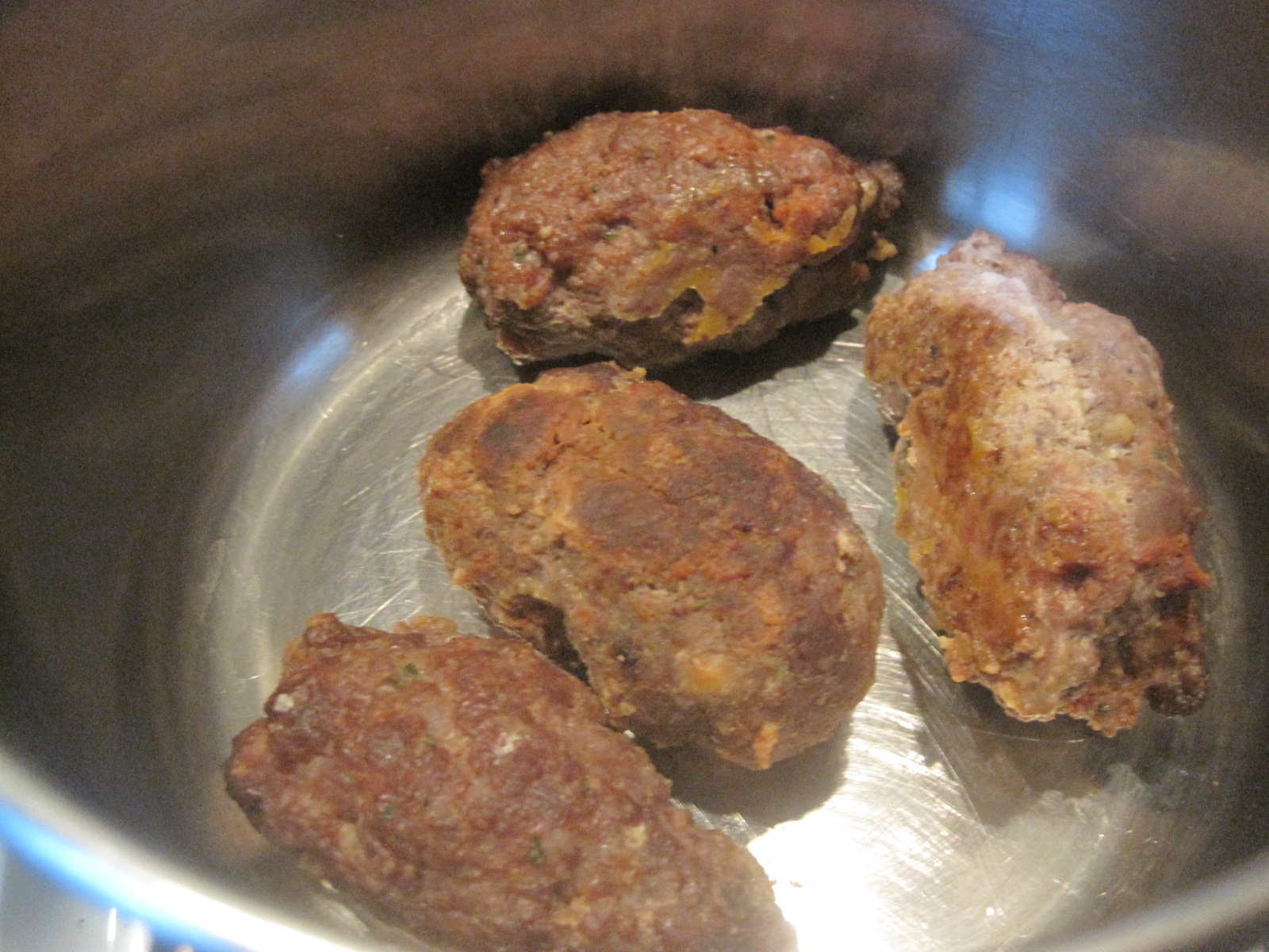 Hackfleischrollen in den Topf legen. Meine kommen aus dem Kühlschrank, weil ich die gerade einen Tag vorher im Ofen zubereitet hatte.