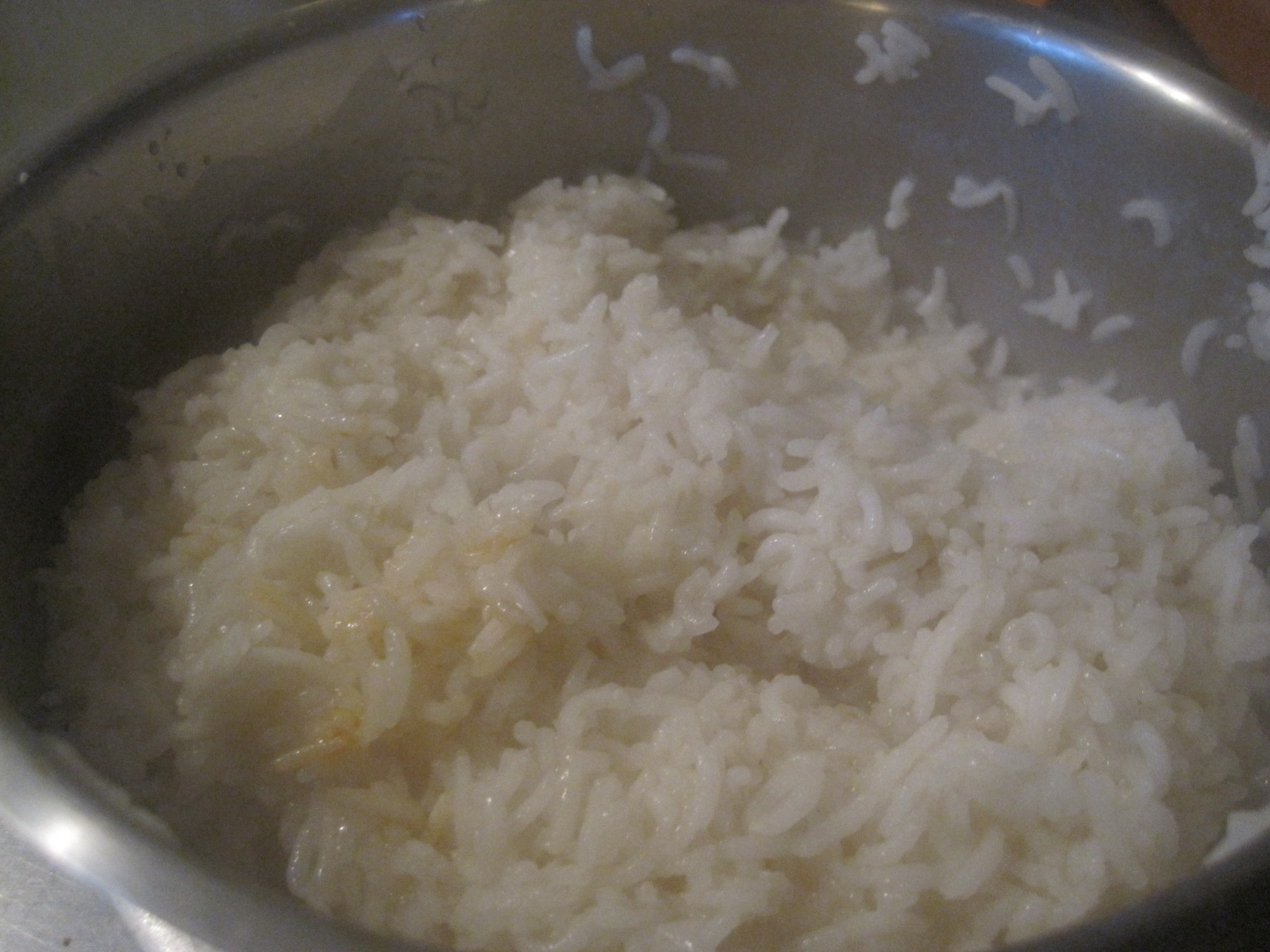 Hier ist der Reis gut gekocht und das Wasser wird komplett aufgesogen. Ich muss da noch ein paar mal nachgießen. Eigentlich ist das der schwerste Teil des Gerichtes.