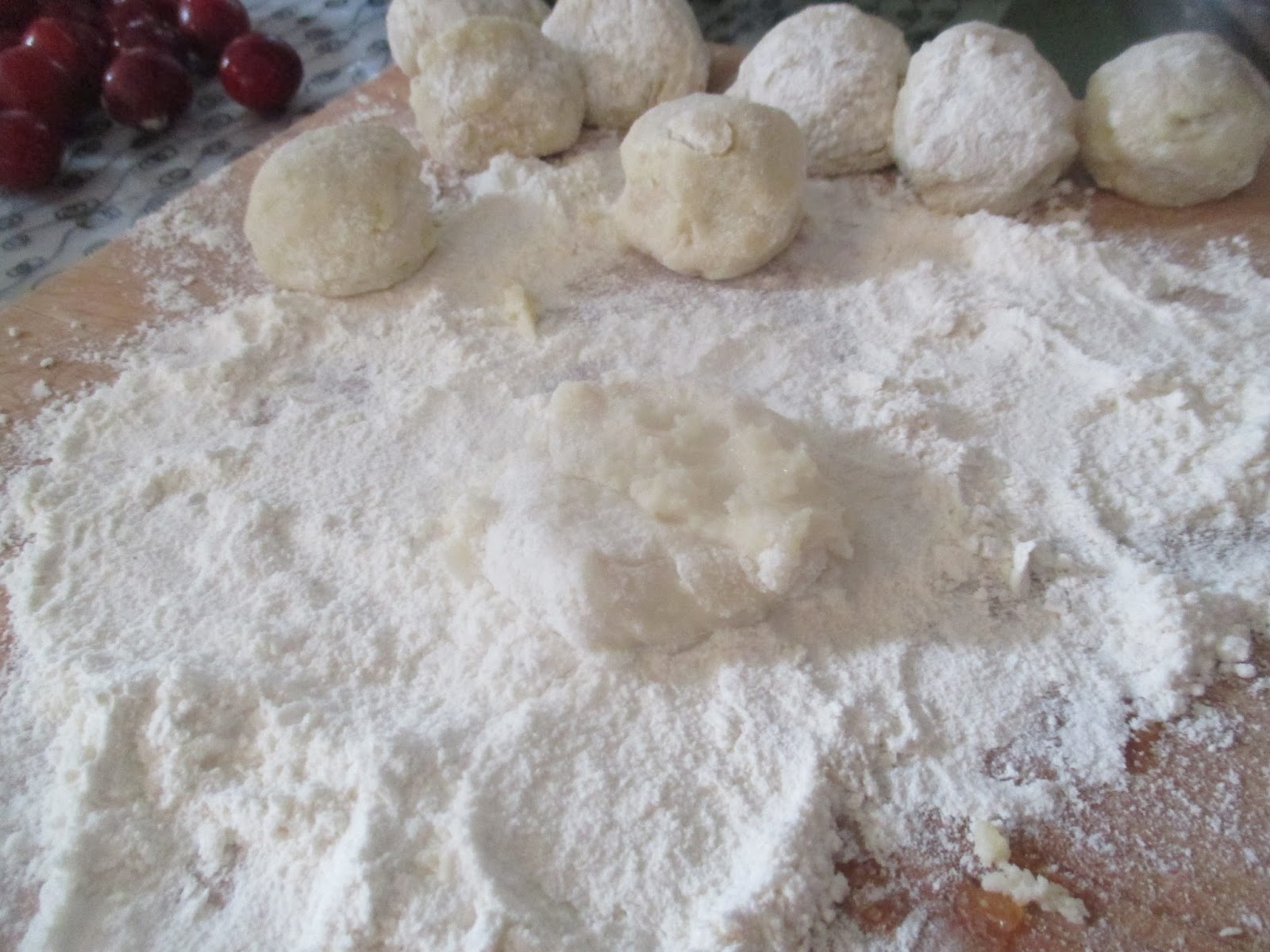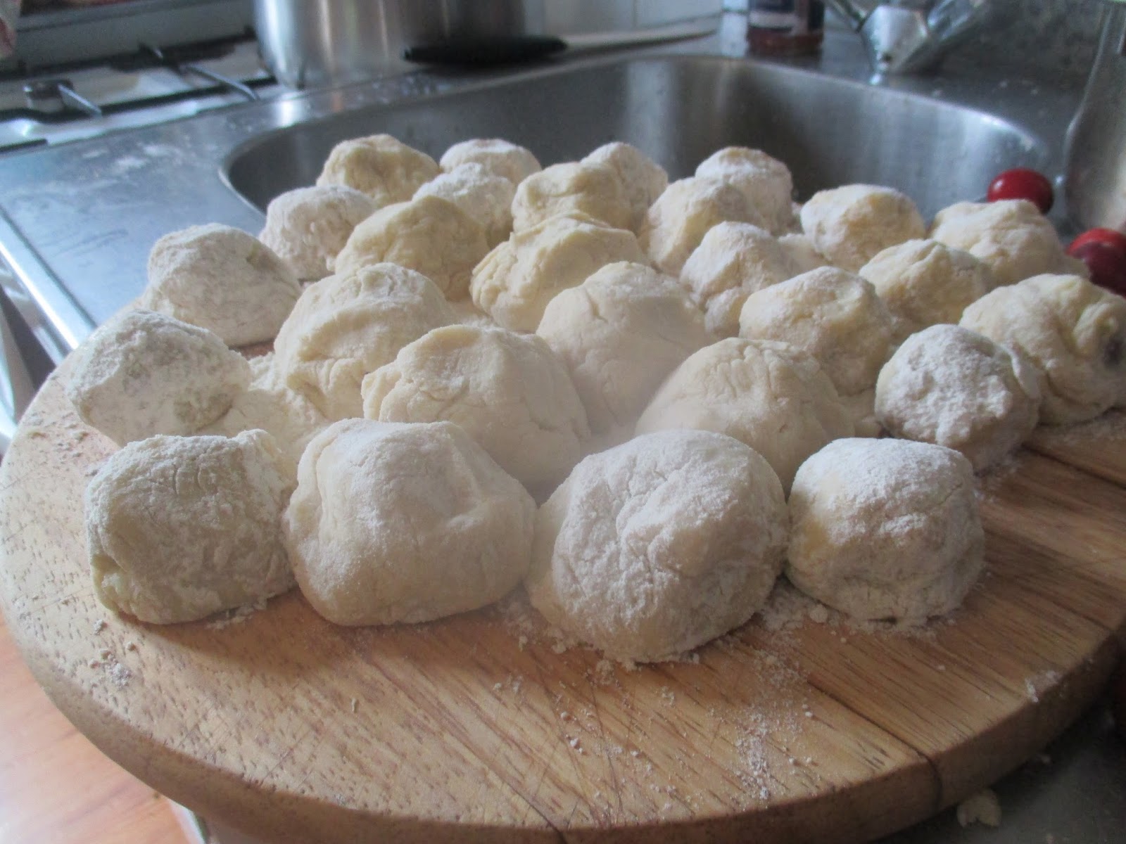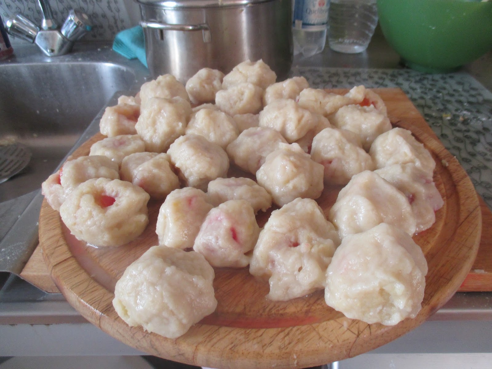Liegt einfach daran, dass mir noch ein wenig die Knödelerfahrung fehlt. Deswegen habe ich die malerisch auf einem Holzbrett gelagert, um sie dann alle auf einen Schlag im Topf ab zu kochen.