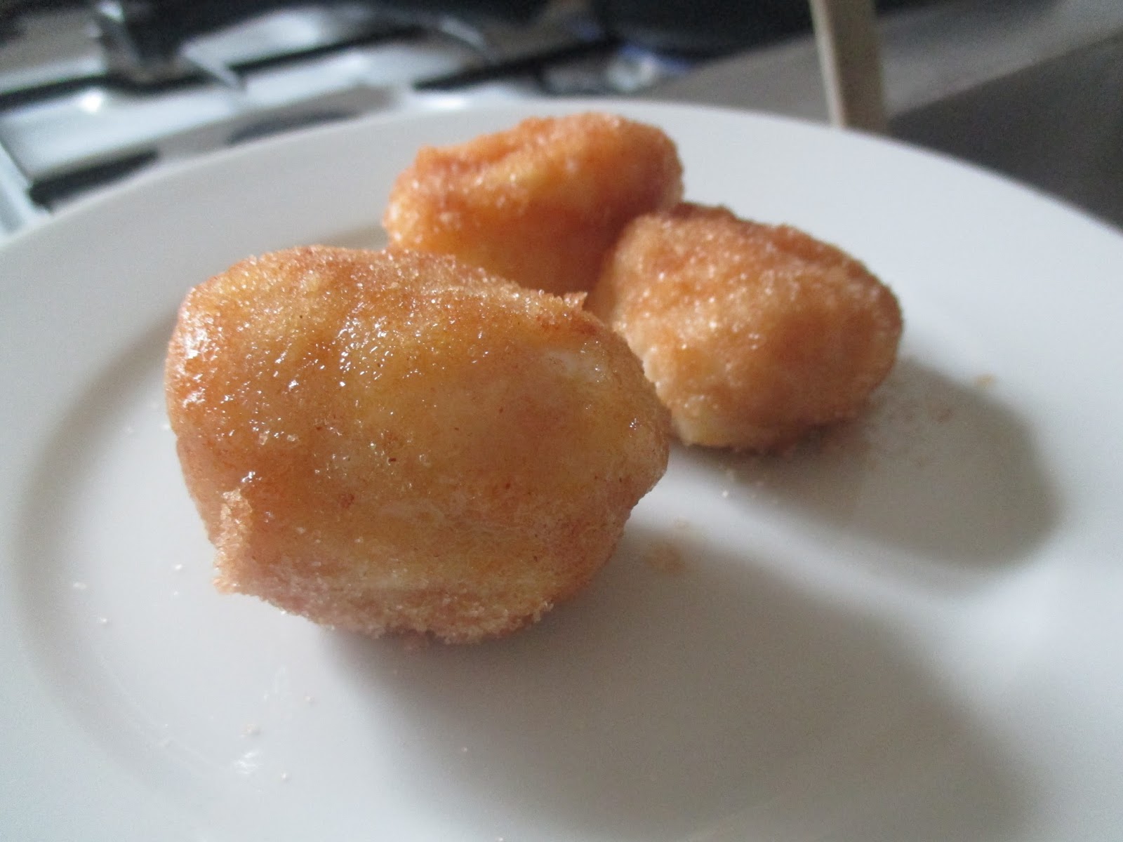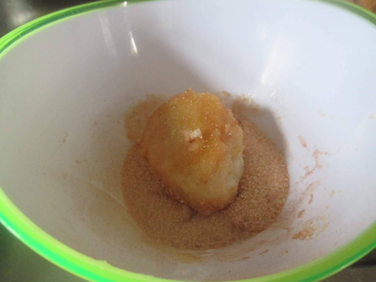 Nach der Pfanne kommen die Mirabellenknödel noch in eine Zucker und Zimt Mischung