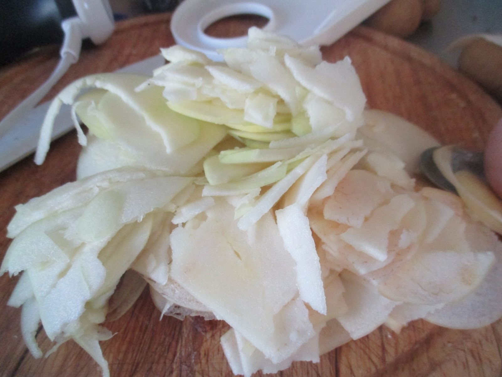 Die Apfel werden mit dem Gemüsehobel in ganz dünne Scheiben gehobelt. Ich hobel immer bis zum Kerngehäuse und danach wechsele ich dann die Seite.