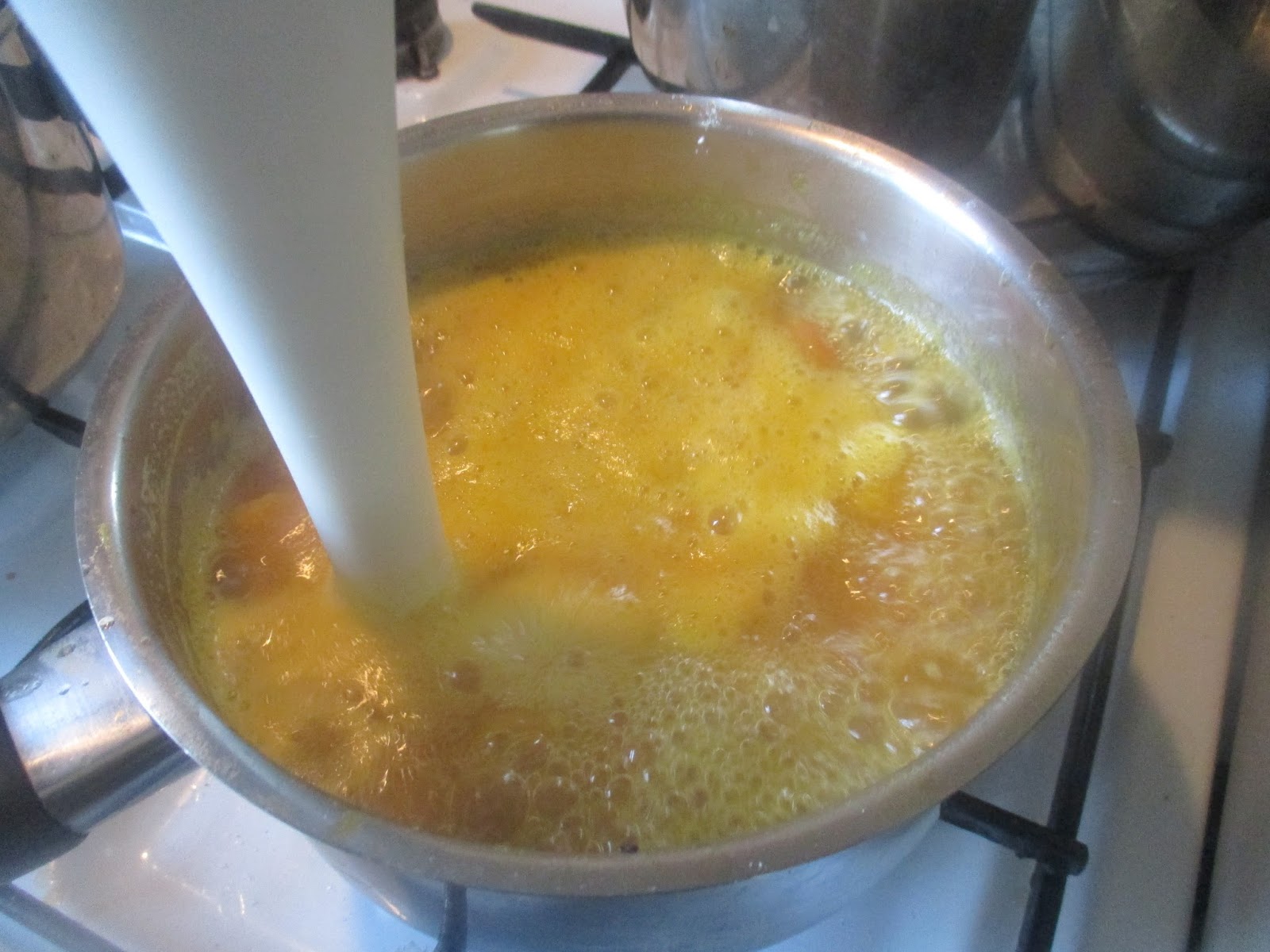Wenn die Mirabellen gut aufgekocht sind und sich das Fruchtfleisch von den Schalen löst, mit dem Pürierstab pürieren.