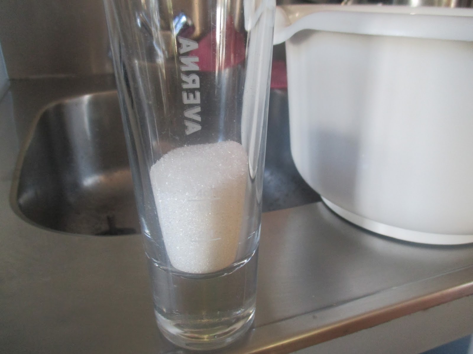 100 Milliliter Zucker abmessen. Ich habe ein Averna Glas mit 20 und 40 Milliliter Eichstrich für die 100 Milliliter Zucker nehme ich halt zwei mal 40 dann noch 20 Milliliter Zucker.