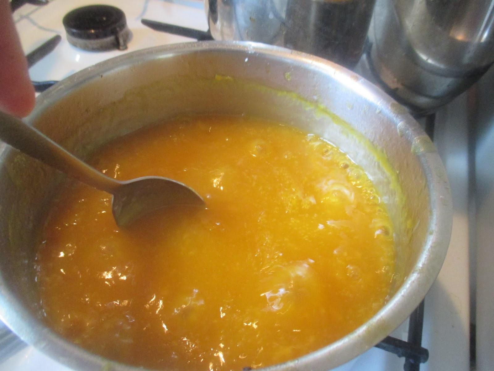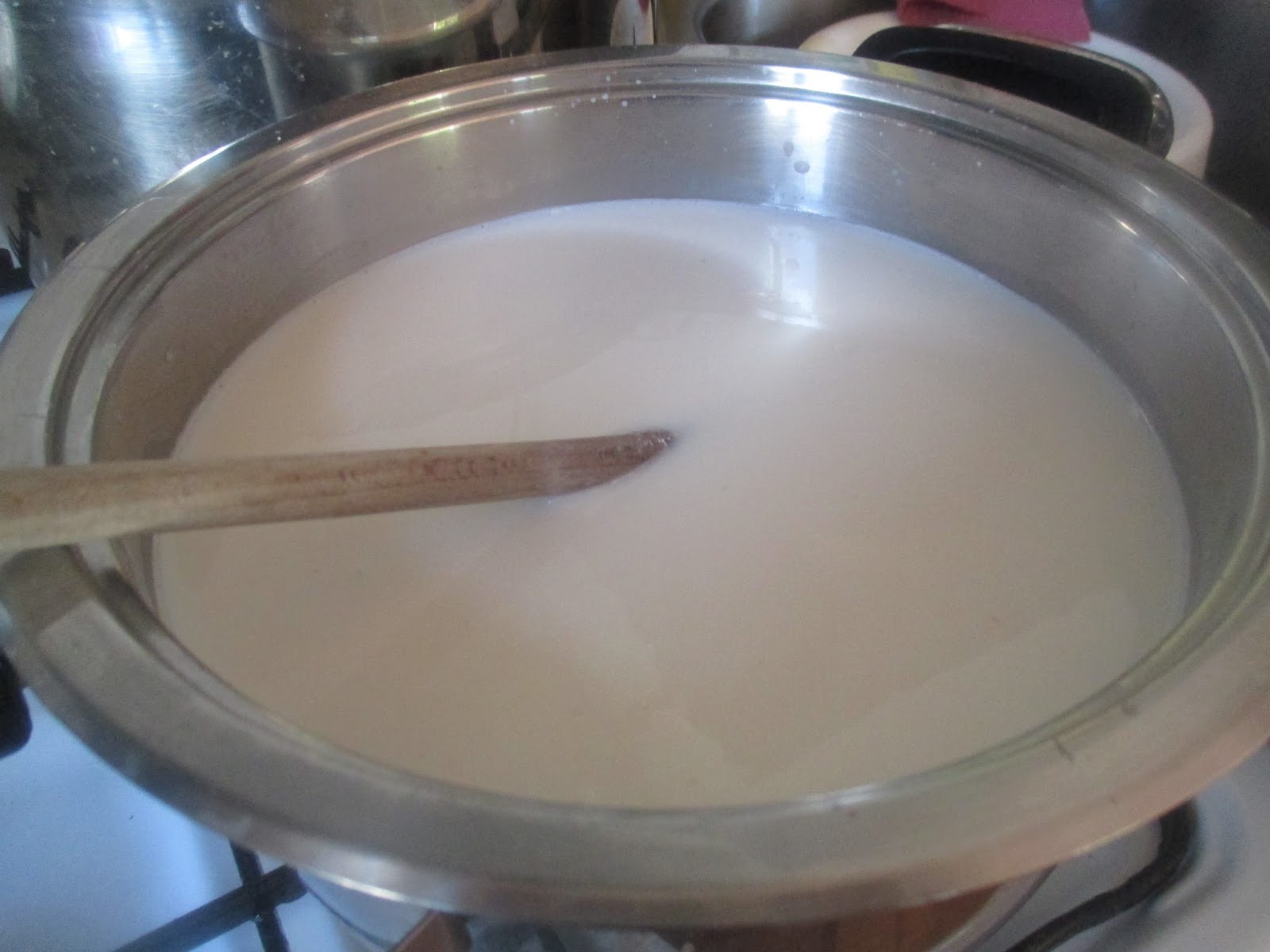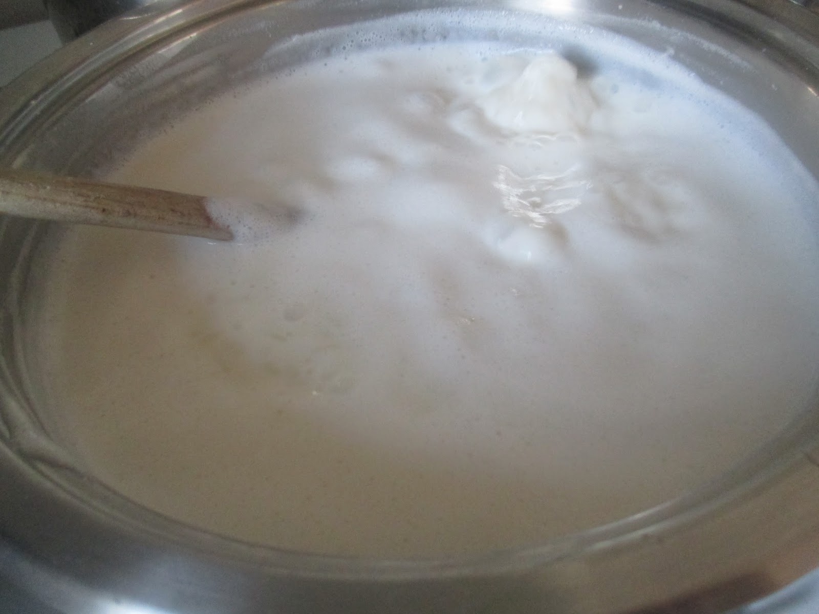 Ich habe mich langsam an die richtige Menge Grieß rangetastet und immer Esslöffel für Esslöffel dazu gegeben. Wichtig ist, dass man ordentlich rührt, damit der Grieß nicht klumpt. Dafür habe ich einen Schneebesen benutzt. Selbst wenn das kurzzeitig verklumpt ist es nicht das Ende. Einfach hartnäckig weiter rühren. Bei 10 Esslöffeln Grieß habe ich beim Aufkochen gemerkt, dass die Masse nach dem Erkalten auf jeden Fall hart wird.