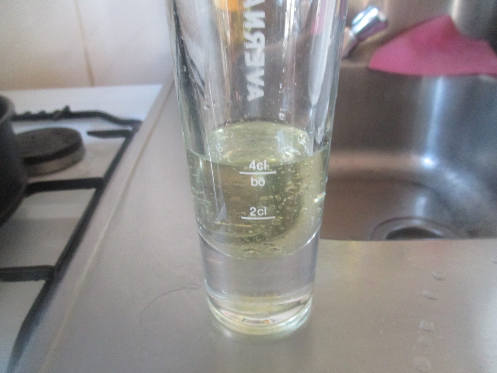 100 Milliliter Wasser. Wer keine Kinder am Tisch hat, kann auch Brandy, Wodka, Wein, oder irgendwas nehmen, was doof macht.