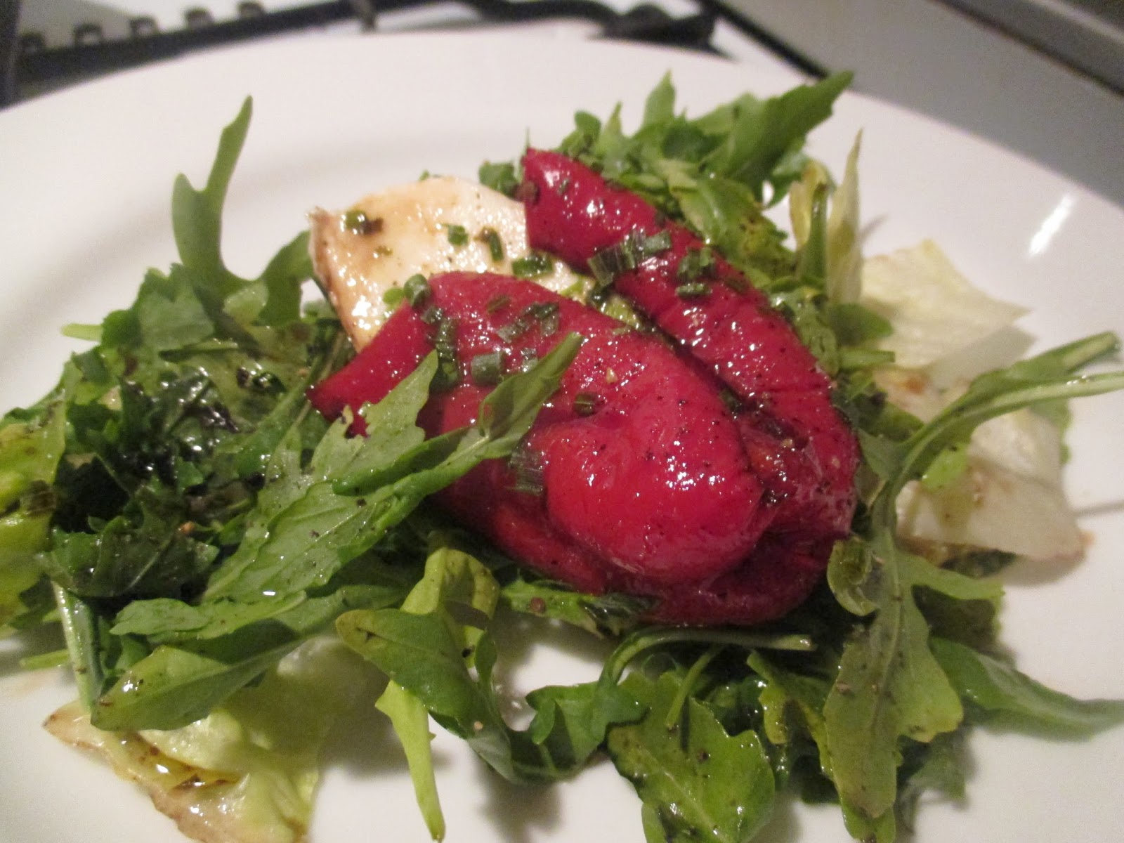 Das Salatdressing über dem Salat und den Ofenpaprika verteilen.