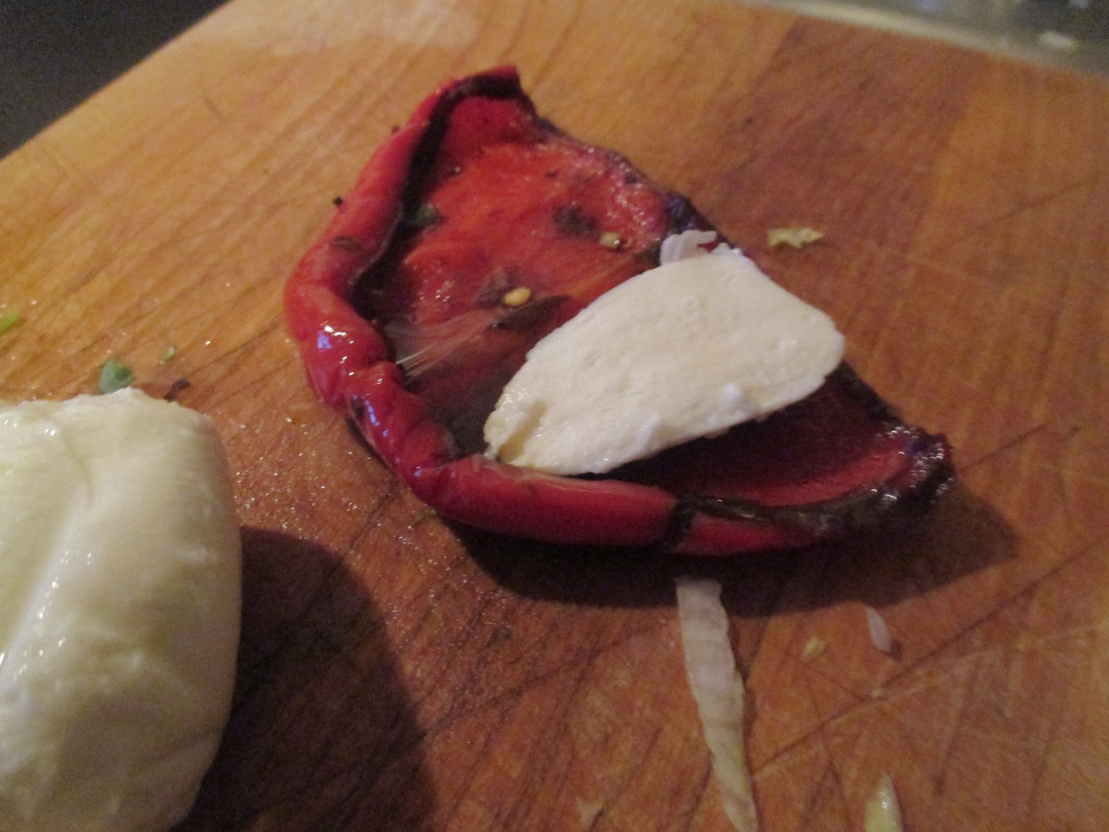 Ich habe die Zahl der halbierten Ofenpaprika gezählt und dann dementsprechend viele Mozzarellastücke aus dem Mozzarella geschnitten