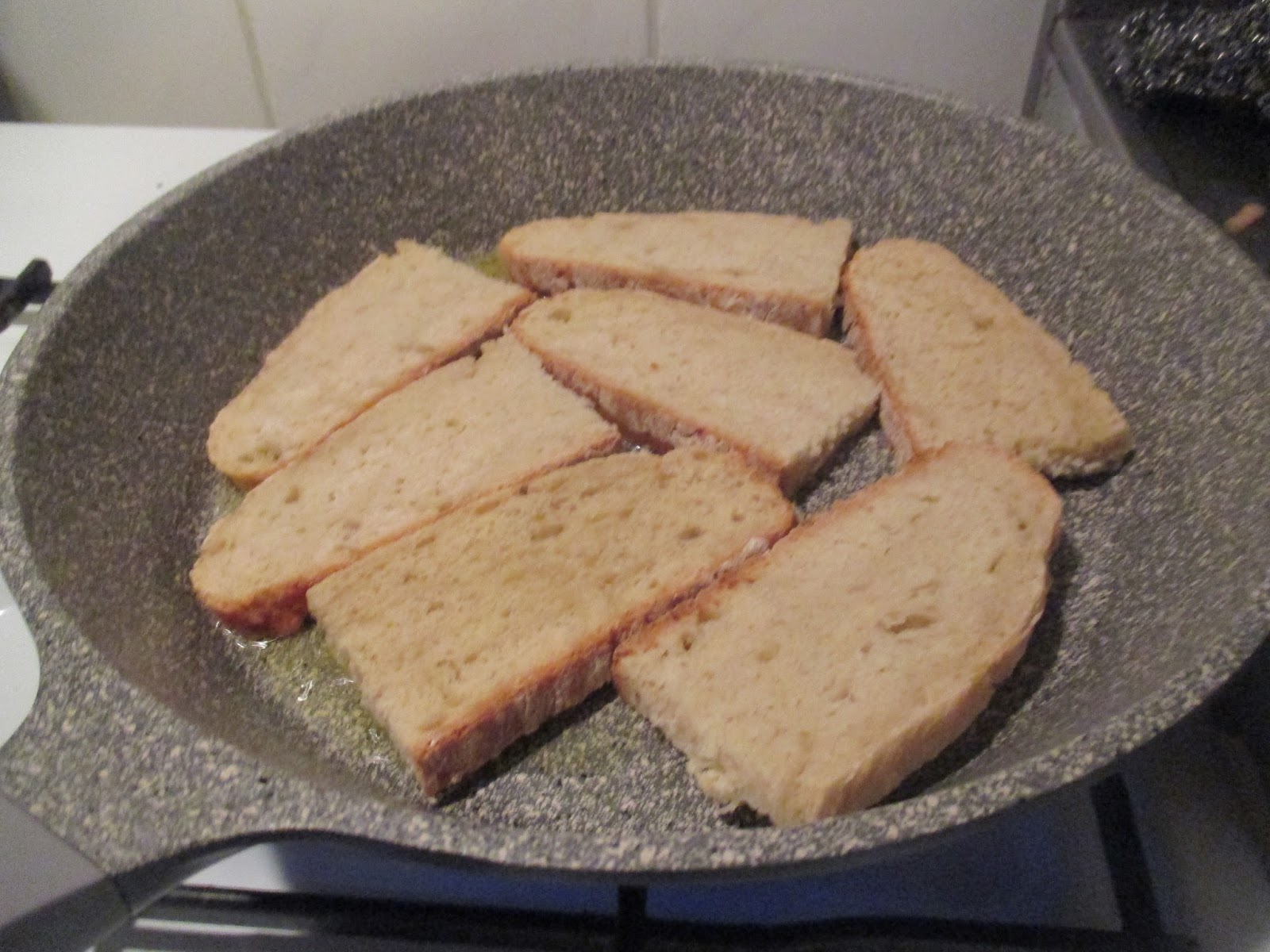 Ich hatte noch Reste meines selbst gebackenen Ciabatta Brotes. Das war zum so Essen eigentlich schon zu trocken, aber wenn man es röstet, ist es immer noch der Knaller. Eine gute Gelegenheit meine neue