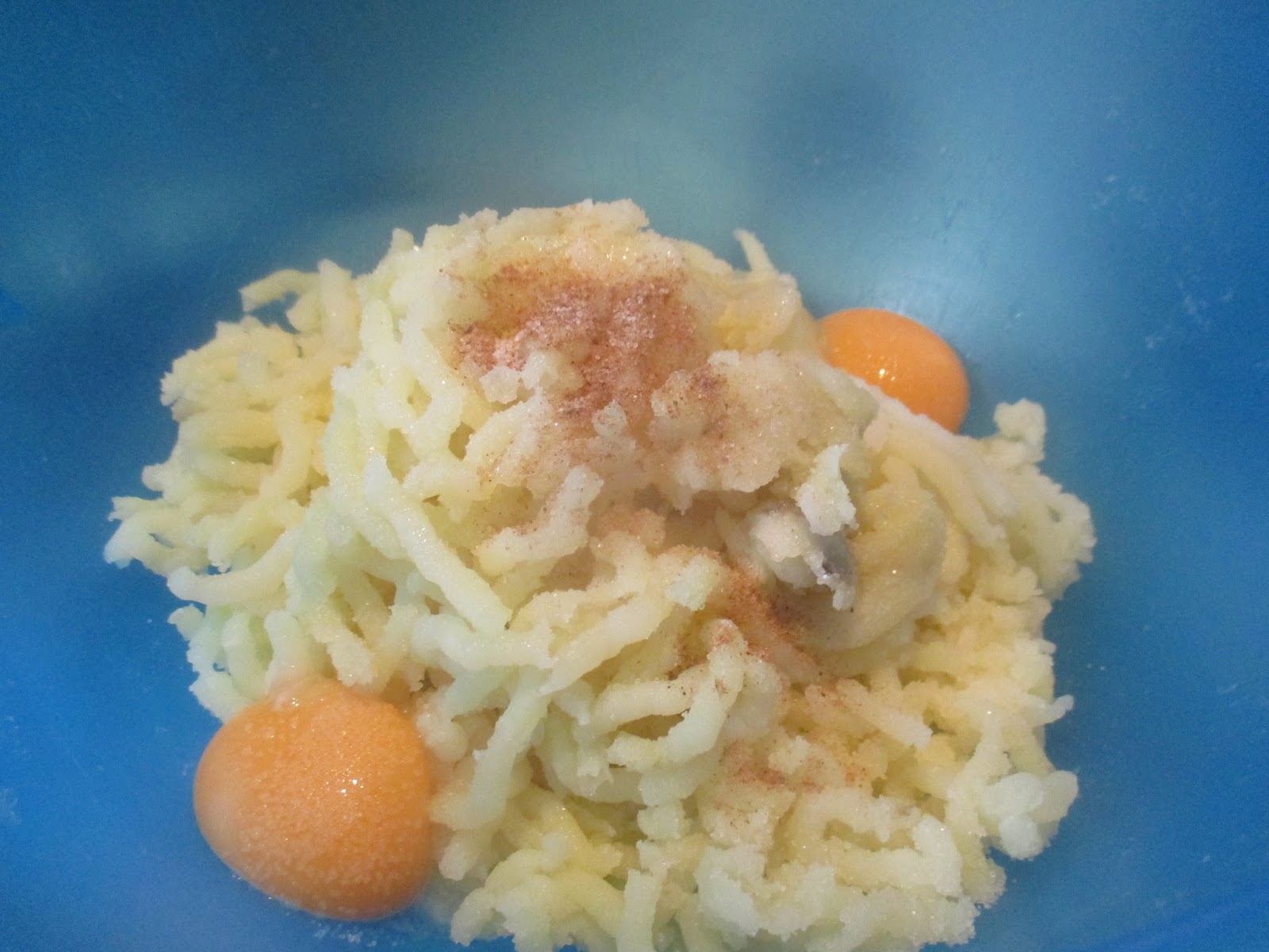 Zwei Eigelb aus dem Ei trennen und zu der Kartoffelmasse geben.