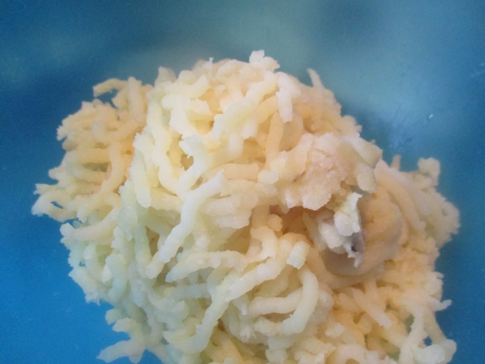 Nach dem Abkühlen die Schale abpellen. Sonst habe ich die Kartoffeln immer mit dem Stampfer bearbeitet, aber den guten Ratschlägen folgend, habe ich dieses Mal meine Kartoffelpresse benutzt.