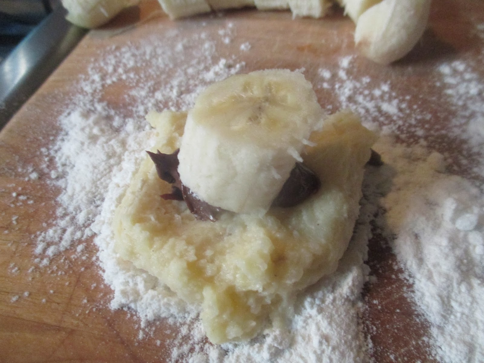 Banane in Stücke schneiden, einen Klecks Kartoffelteig mit einem Esslöffel abstecken und auf der bemehlten Arbeitsfläche ablegen.
