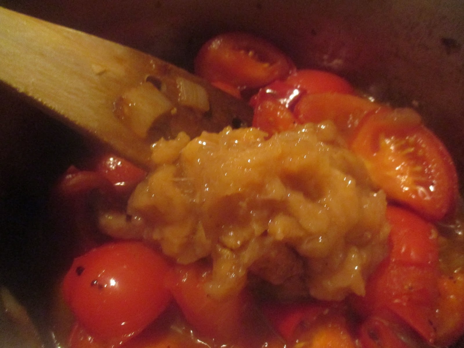 Die Bananenmarmelade kommt in den Topf, wenn die Tomaten schon ordentlich Flüssigkeit abgegeben haben und schon weich werden.
