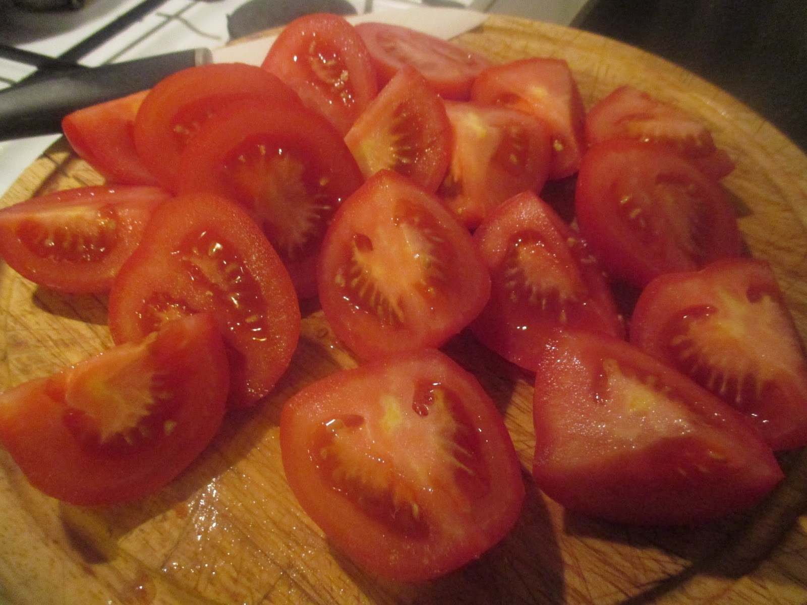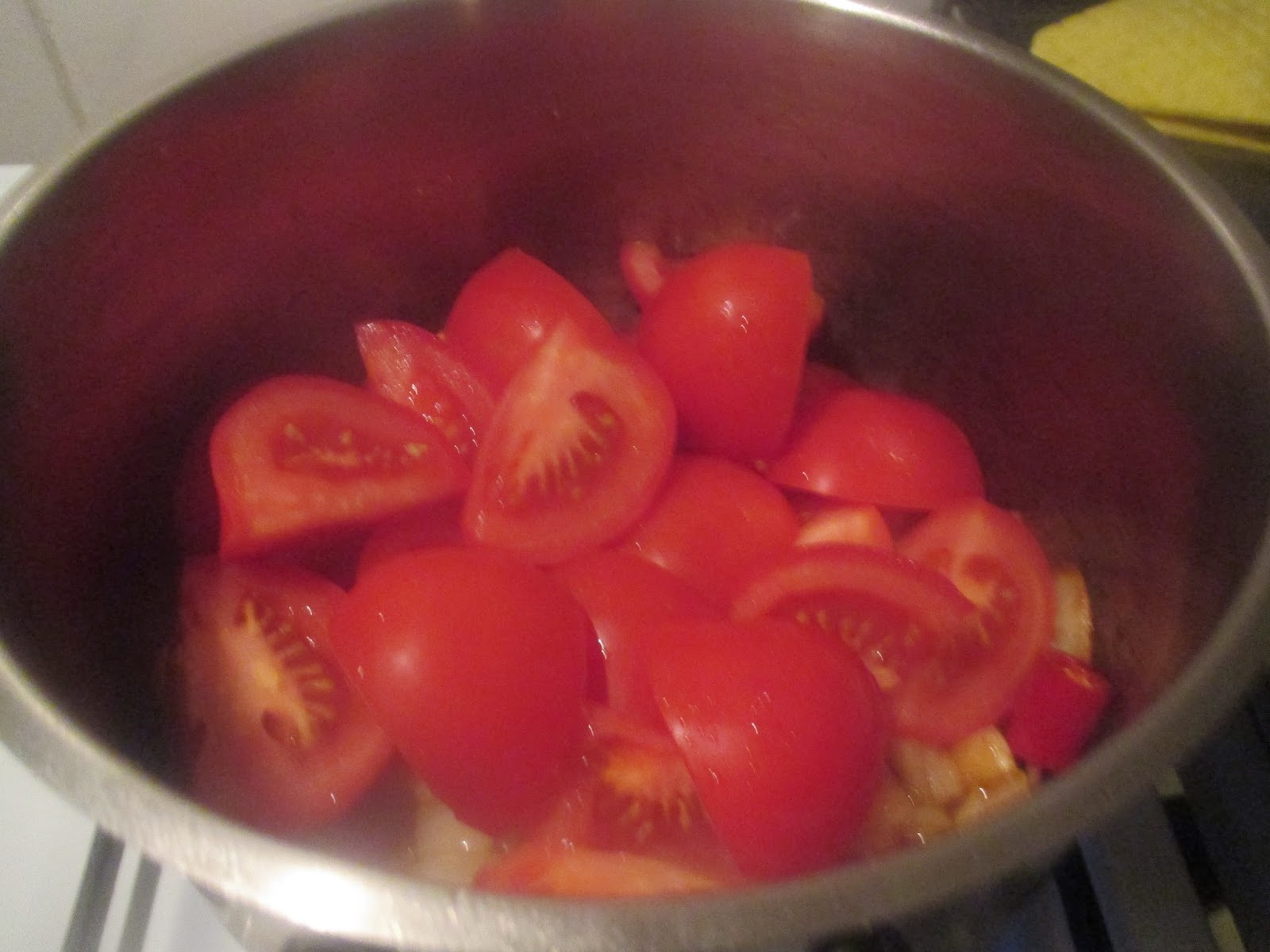1 Kilo Tomaten von den Strunken befreien und grob zerkleinern. Am Ende wird alles püriert als nicht übertreiben mit der Arbeit.