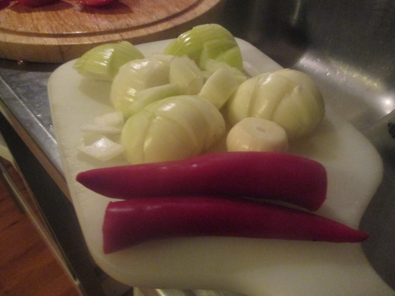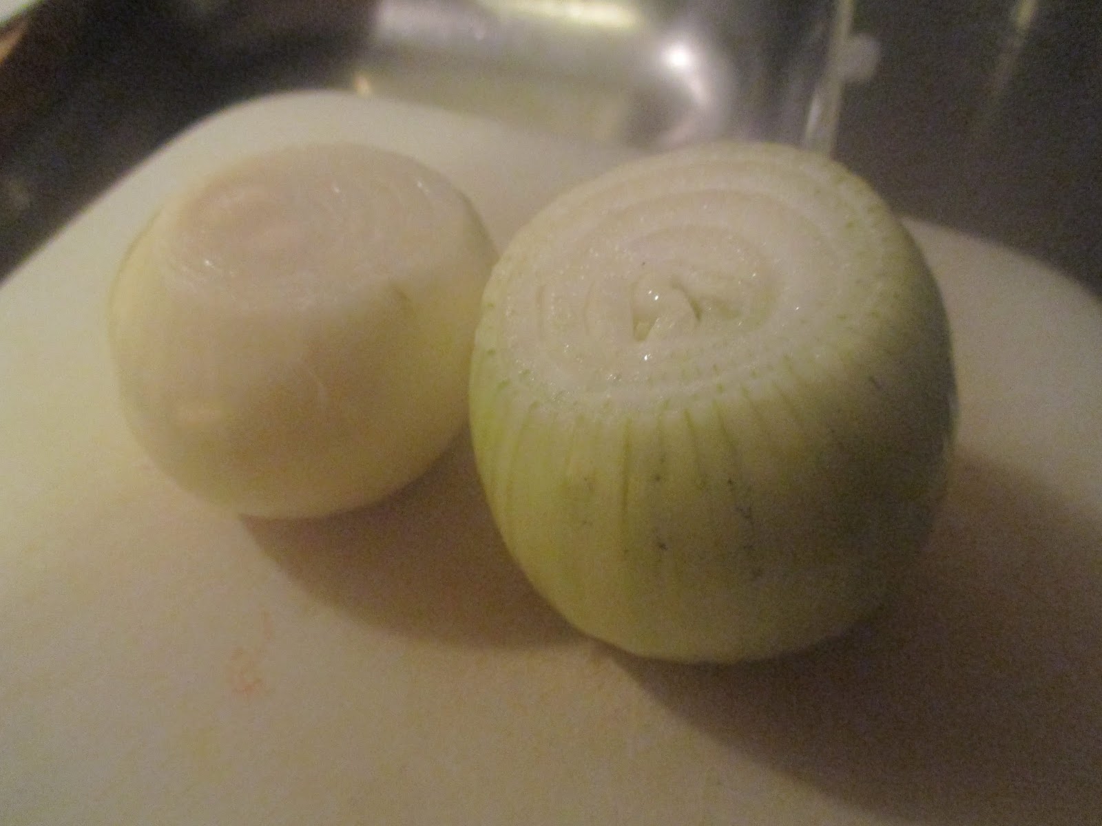 Zwei Zwiebeln zerkleinern und hier habe ich mal zum Größenvergleich diese kleine Knoblauchknolle daneben gelegt, von der ich spreche, wenn ich Knoblauchknollen meine. Ich werde mir den richtigen Namen nie merken. Freilandknoblauch?? Schlauberger vortreten!