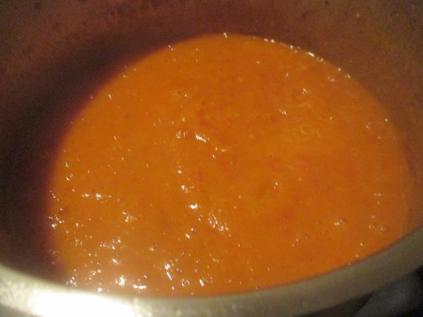 Auf kleiner Flamme 15 Minuten mit Deckel köcheln lassen und danach mit dem Pürierstab komplett zerschreddern.