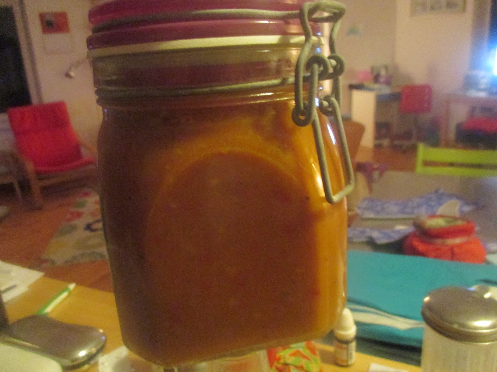 Danach noch einmal 15 bis 20 Minuten vor sich hinköcheln lassen. Das ist zwar noch ziemlich flüssig, zieht aber nach dem Erkalten richtig an. Ich habe die Currysoße in ein Glas umgefüllt und dort für den nächsten Tag gelagert. Das Glas schließt richtig ab und man könnte es ungeöffnet über einen längeren Zeitraum ungekühlt lagern. Nach dem Öffnen ist es natürlich ein Fall für den Kühlschrank und hält dort auch ewig.