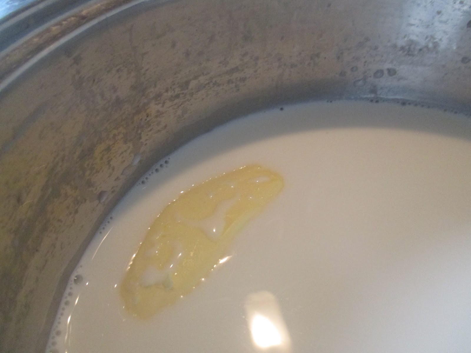 Jetzt kommen wir zu den Milchnudeln. 2 Liter Milch in den Topf füllen, nach Geschmack Zucker und einen Esslöffel Butter dazu geben. Die Prise Salz nicht vergessen.