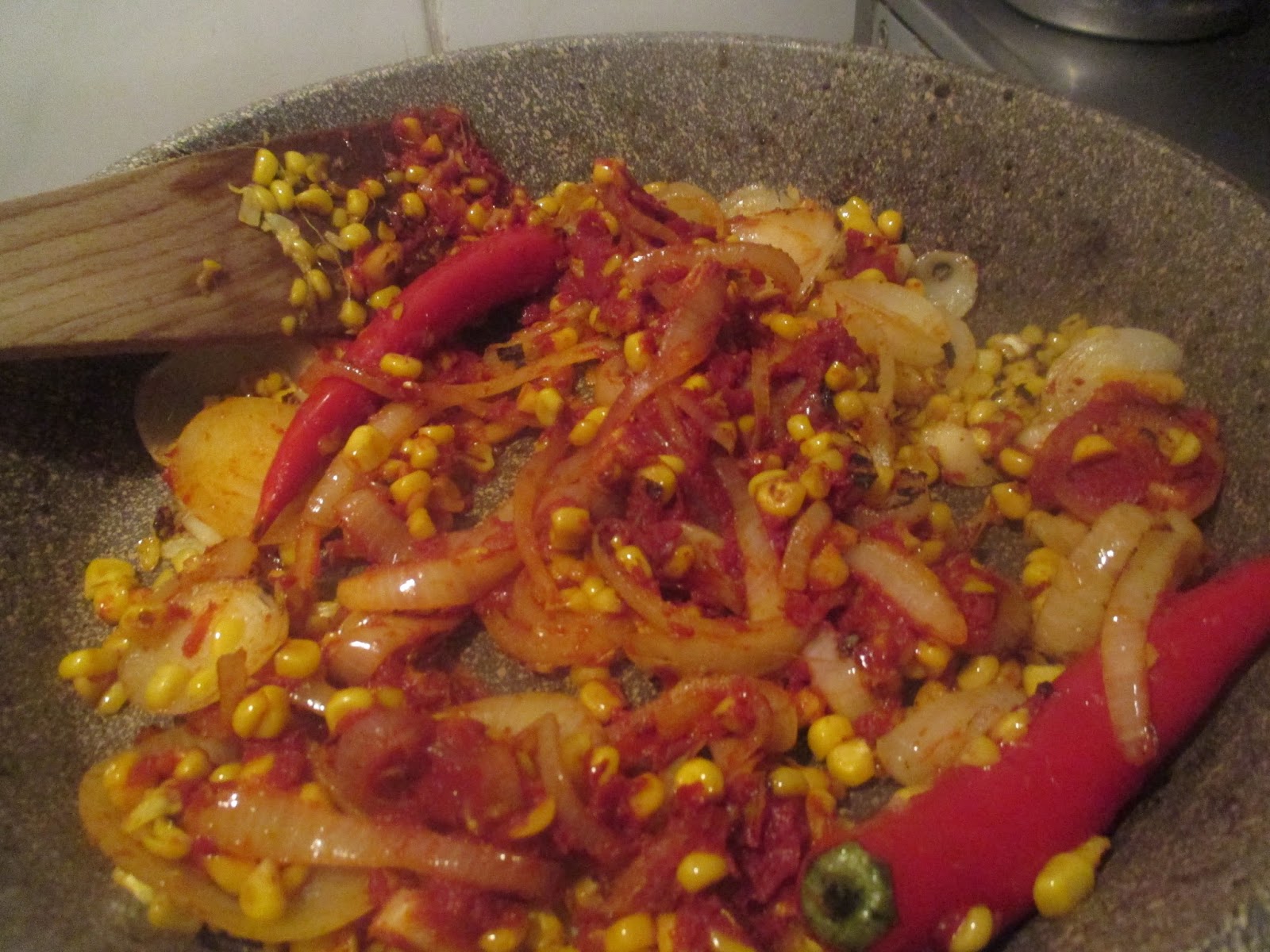 Wenn der Mais und die anderen Zutaten ein wenig Farbe bekommen haben, 100 Milliliter Tomatenmark in die Pfanne geben, um noch ein paar gepflegte Röstaromen zu zaubern.