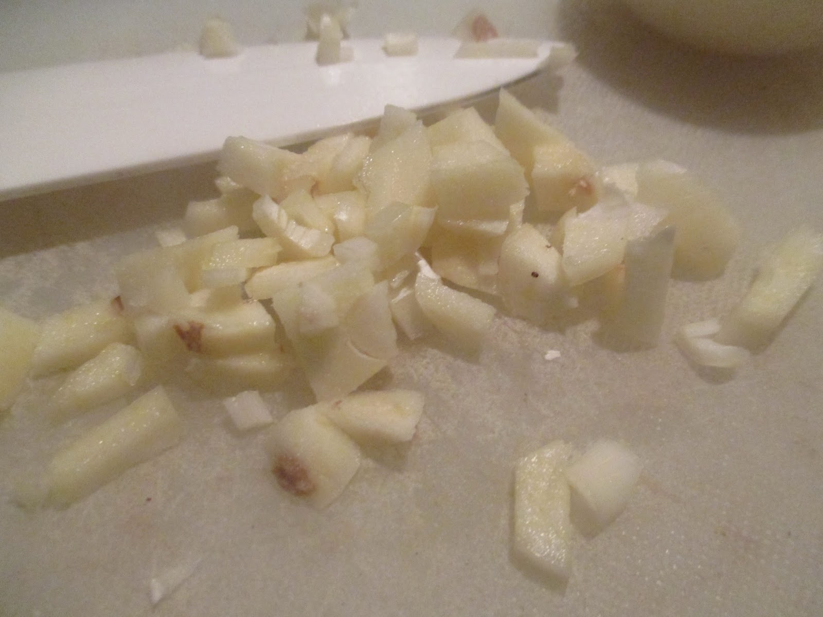 Zwei Zwiebeln häuten und zerkleinern. Daneben habe ich zum Größenvergleich meine bevorzugte Knoblauchgröße gelegt, damit keiner meint, man müsste so einen Riestentrümmer mit 24 Einzelzehen verwenden. Wenn ich nicht so ignorant wäre, könnte ich Euch auch genau sagen wie das heißt, aber ich weiß, das ist ein geflochtener Korb und der kostet immer 1,99 egal ob ich das bei Netto oder bei Kaufland kaufe.