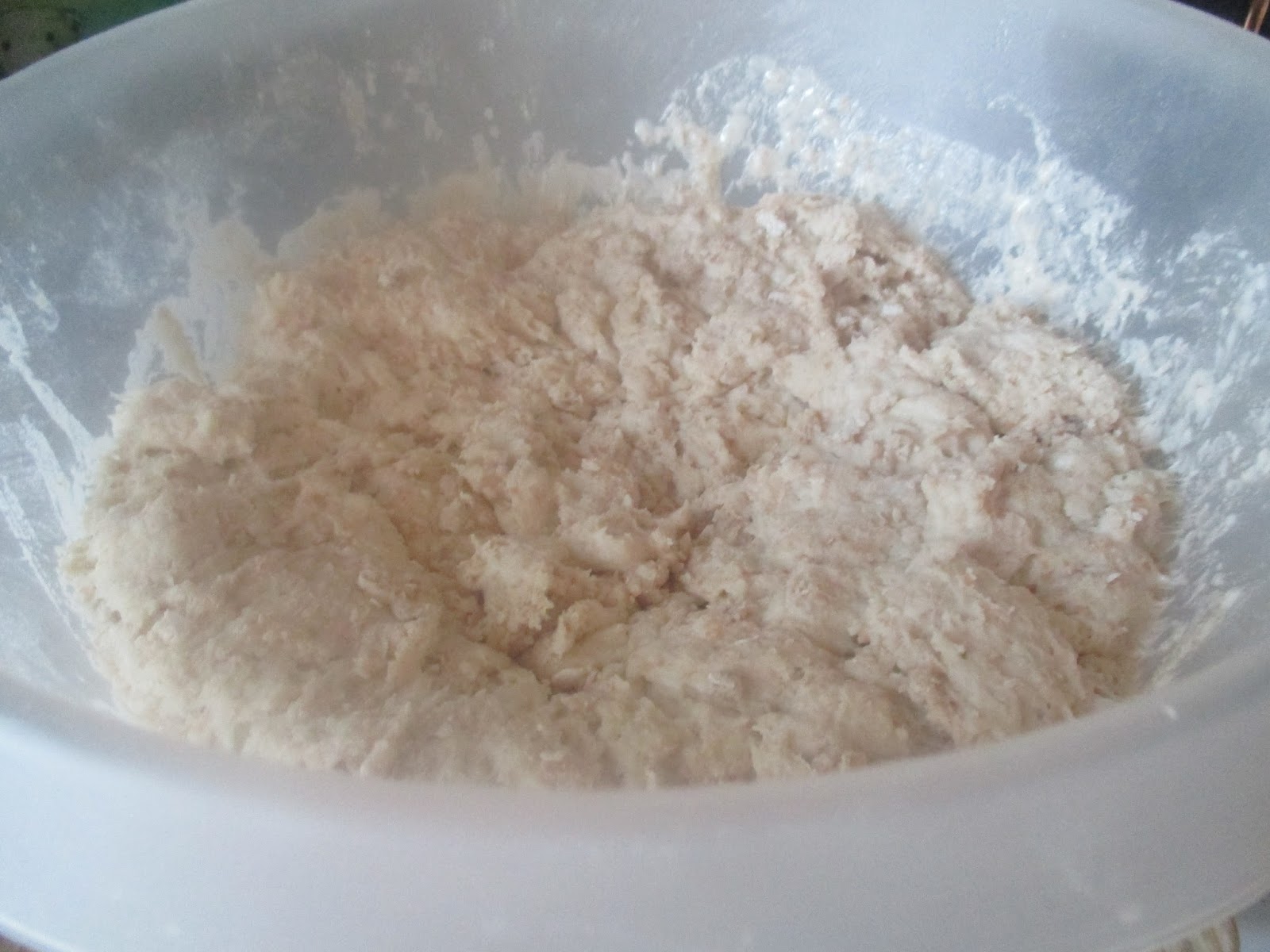 Nach zwanzig Minuten Ruhezeit, kommt die Hefe zum Mehl und dem restlichen Wasser in die Rührschüssel. Ich rühre das mit einem Pfannenwender, oder Kochlöffel so weit es geht und den Rest knete ich mit der Hand, wenn ich das Gefühl habe, dass sich die Zutaten noch nicht richtig vermischt haben.