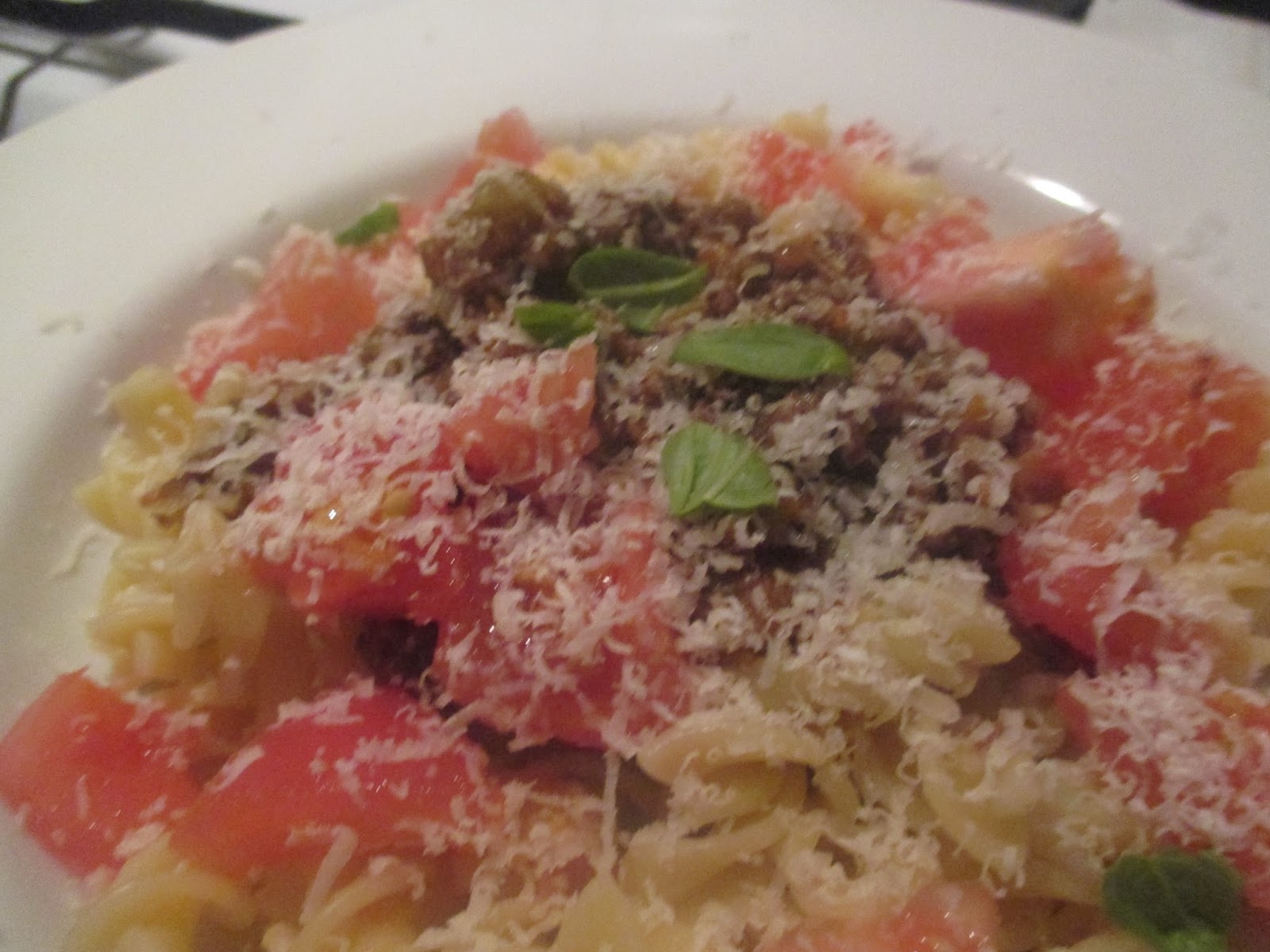Weil ich die ganzen Kinder am Tisch hatte und meine Frau dabei auch noch einhändig mit quengelndem Säugling auf dem Arm essen musste, habe ich keine Bandnudeln genommen, sondern musste auf Spiralen ausweichen. Passt mir auch nicht, ist aber unserer Familienpolitik geschuldet. Da kann noch niemand Spaghtti mit der Gabel aufdrehen. Besser als Bolognesefix von irgendwem, ist es trotz der falschen Nudelwahl auf jeden Fall.