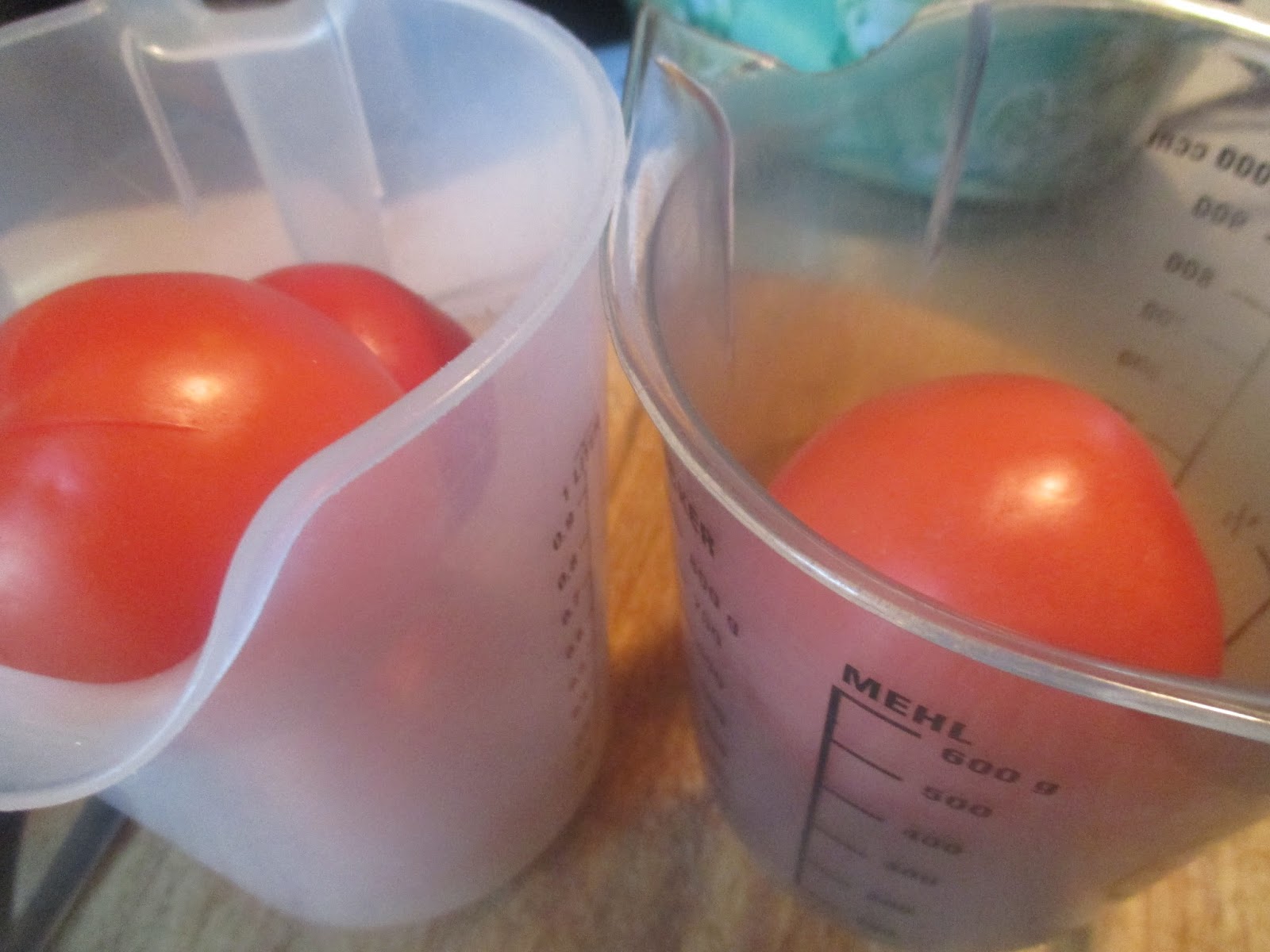 Tomaten in einen Topf, oder ein Litermaß legen und mit kochendem Wasser übergießen.