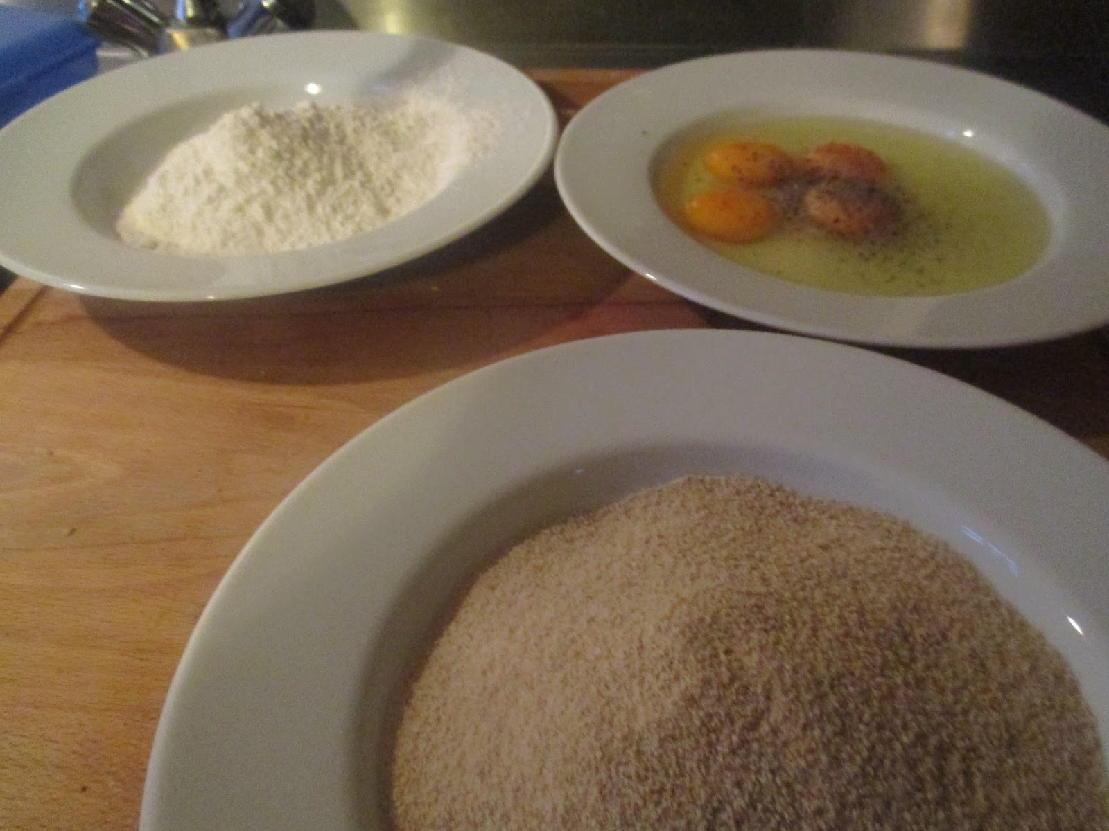 Nun kann das Fleisch paniert werden. Die Teller sind in der Reihenfolge aufgebaut, wie das Fleisch paniert wird.
