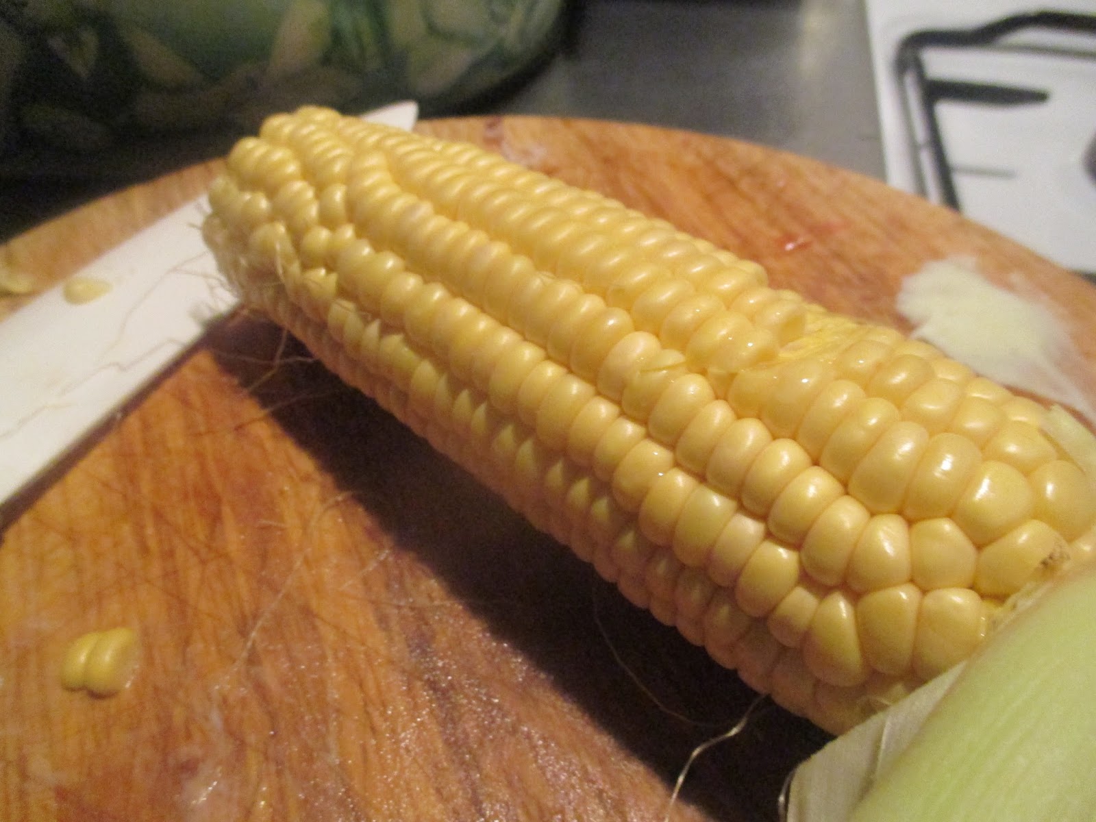 Ich habe das Glück frischen Mais zu ergattern. Einfach mit einem scharfen Messer vom Kolben runter schneiden