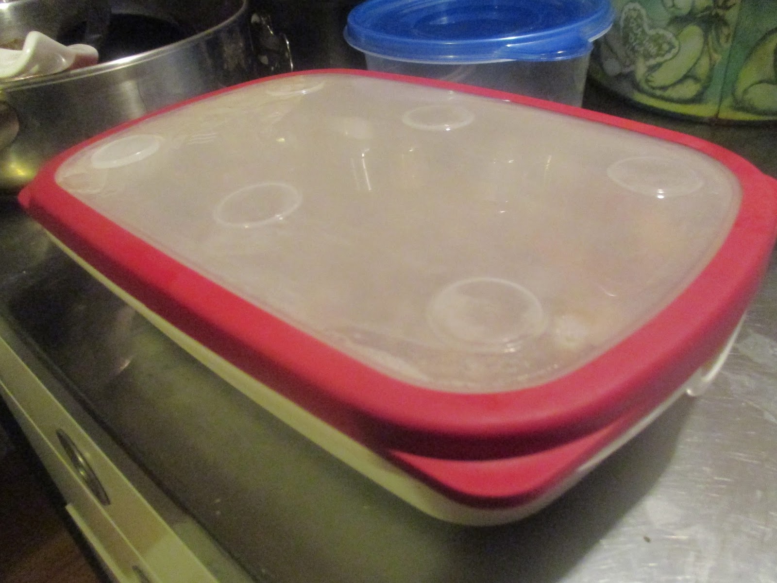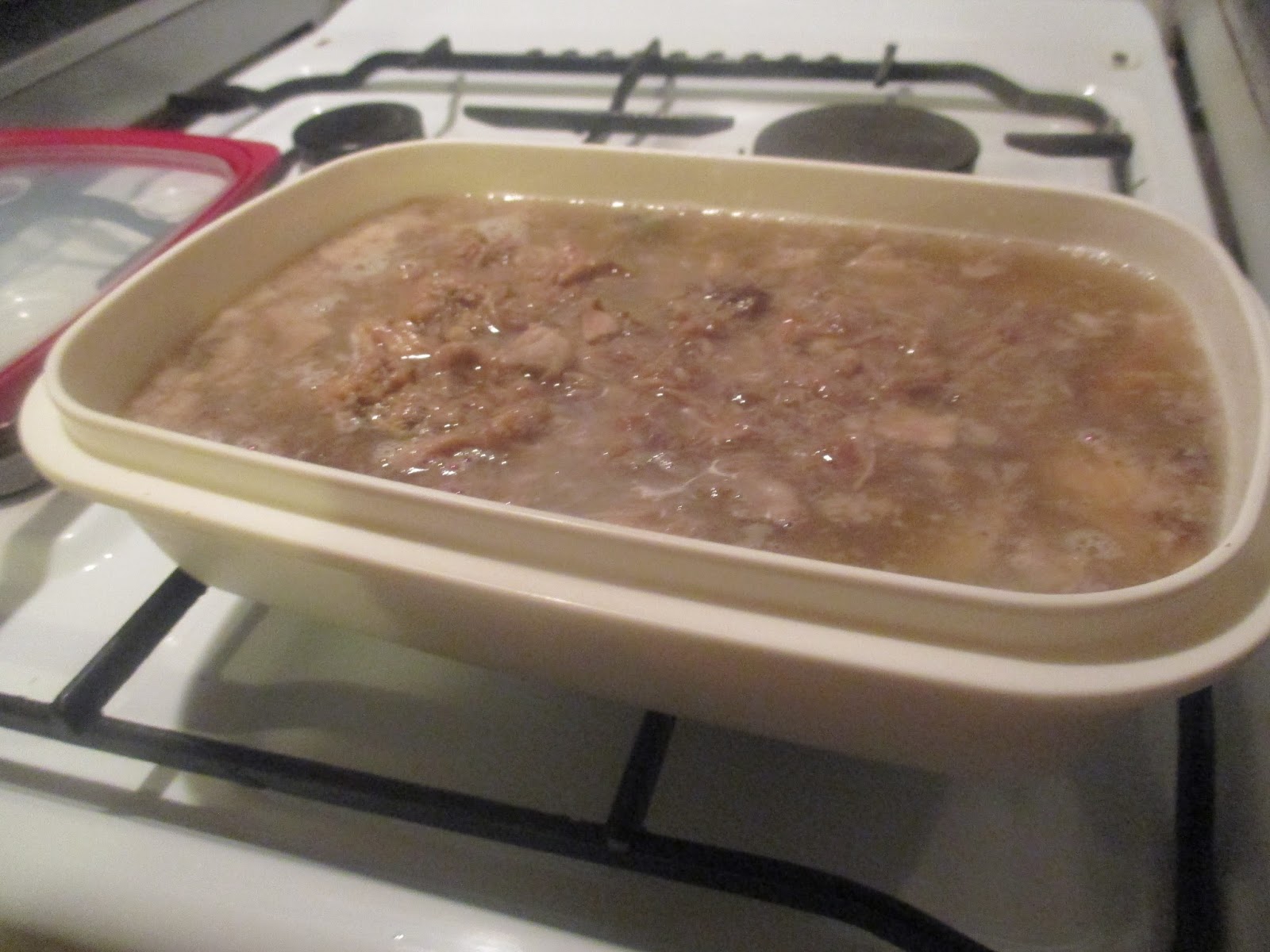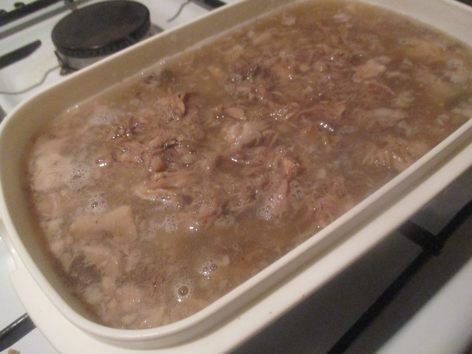 Danach die Brühe und das Fleisch in eine Form geben, die man evtl. auch mit einem Deckel verschließen kann. Man soll warme Gerichte nicht in den Kühlschrank stellen, also außerhalb des Kühlschranks abkühlen lassen und wenn die Form ungefähr Raumtemperatur hat, in den Kühlschrank stellen. Das würde ich abends machen und ab dem nächsten Tag zum Frühstück essen, um ein ungefähres Zeitfenster zu geben, wie lang die Wartezeit ist.