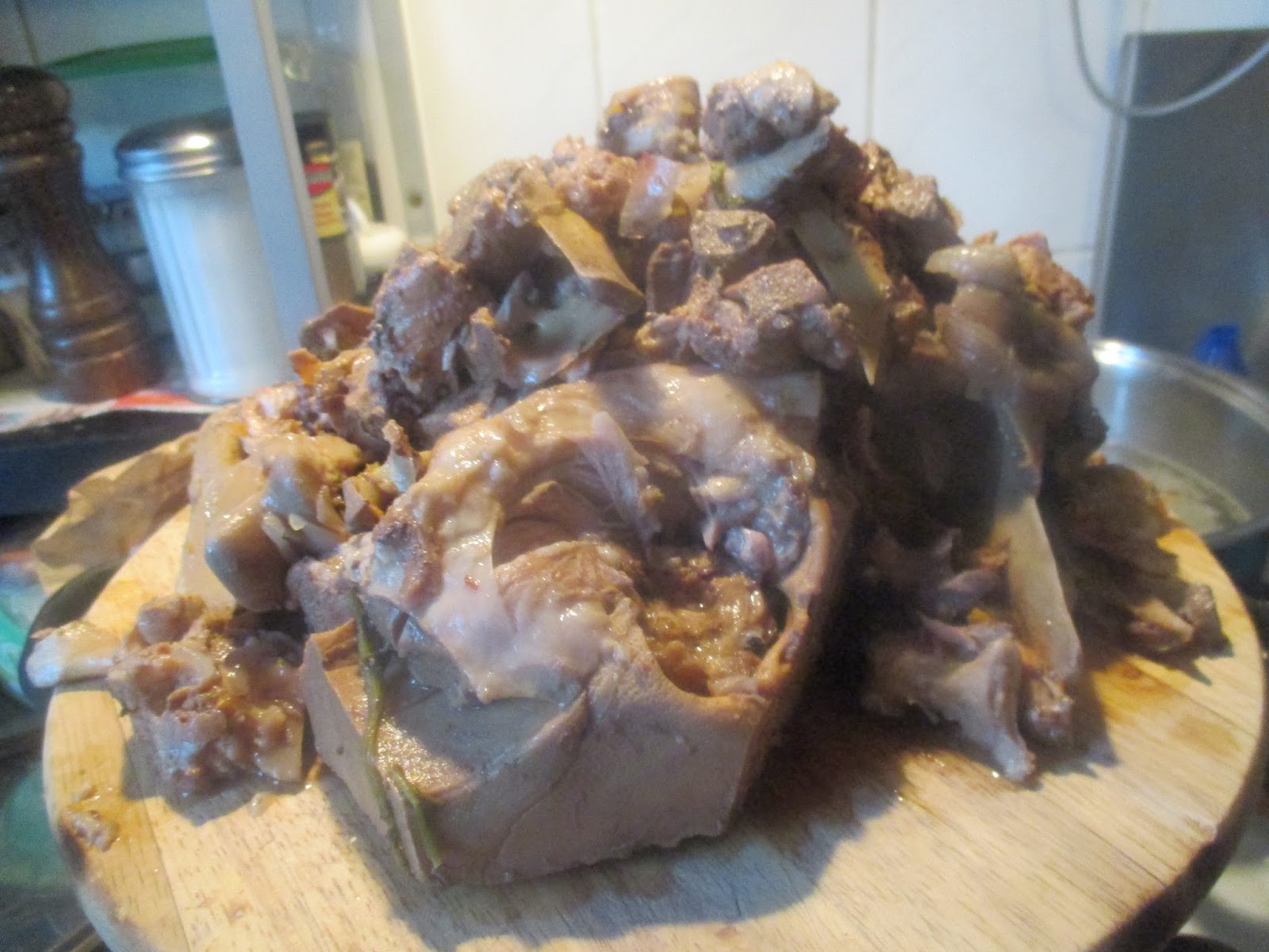 Dafür muss man Fleisch wirklich mögen, denn jetzt muss man aus dem ganzen Berg überall das Fleisch von den Knochen trennen und das aussortieren, was man nicht im Sauerfleisch haben will, Speckschwarte, Knochen und alles, was im Munde keinen Spaß macht.