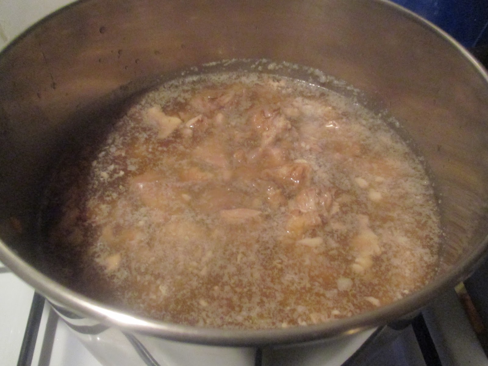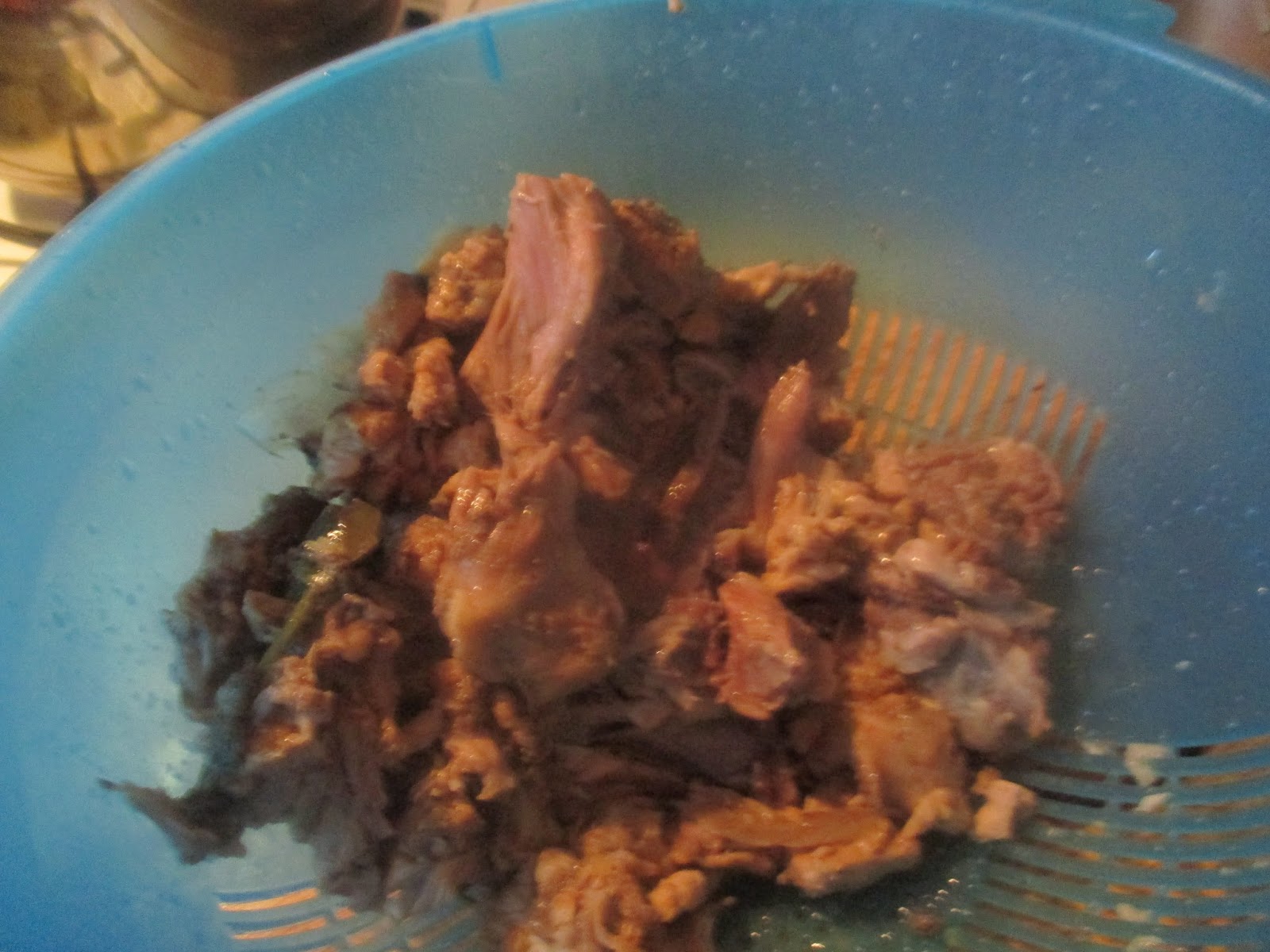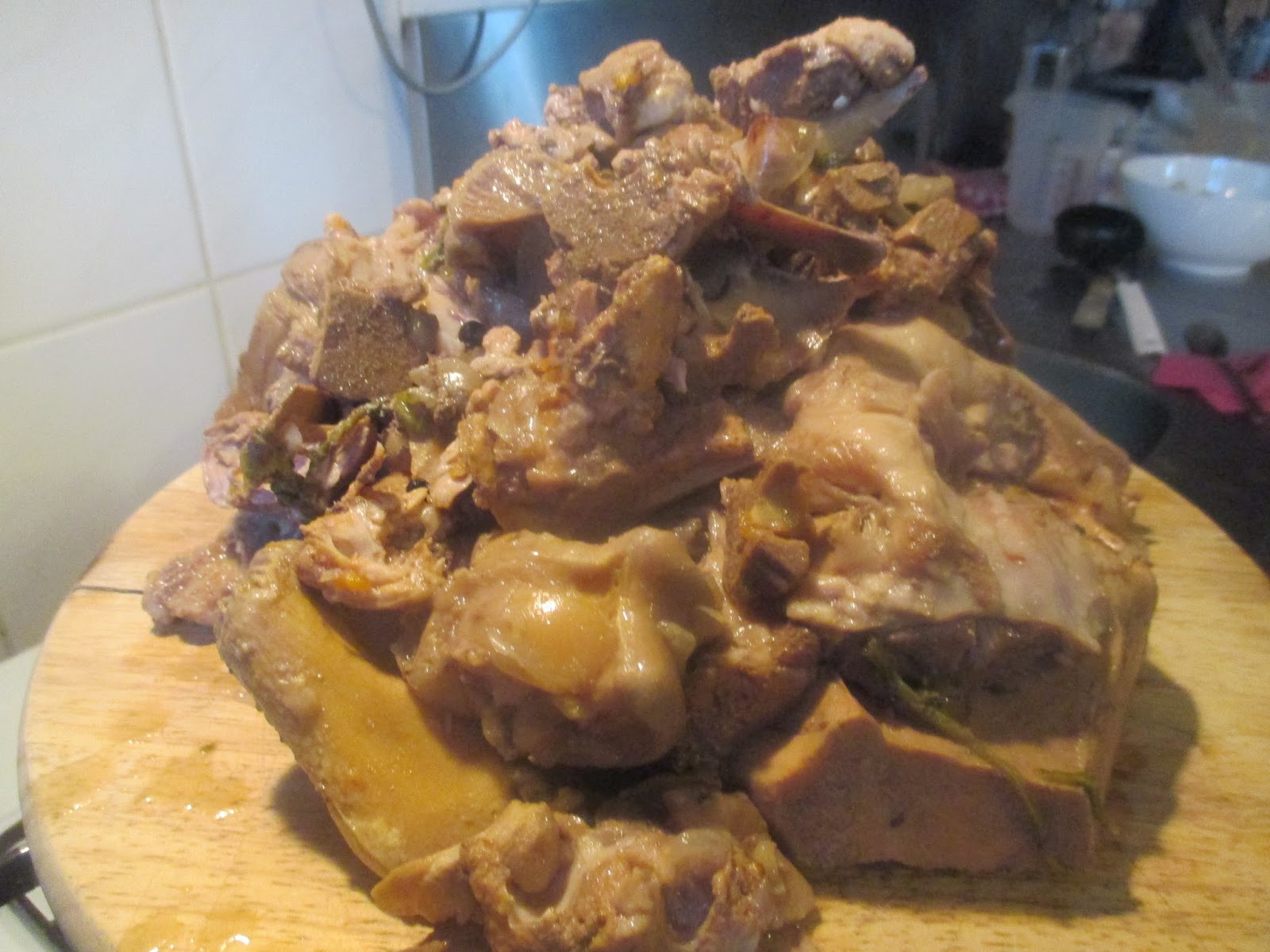 Hier ist der Haufen Fleisch, den ich aus der Brühe gefischt habe. Nachdem ich die Brühe sieben Stunden auf kleiner Flamme simmern und danach bis zum nächsten Tag abkühlen lasse, verbrennt man sich dabei auch nicht die Finger. Das ist alles, was von den Knochen, vom Schweinskopf und den Schweinepfoten übrig geblieben ist. Durch die geringe Hitze ist es nicht besonders zerfallen, nach den ganzen Stunden aber natürlich sehr zart.