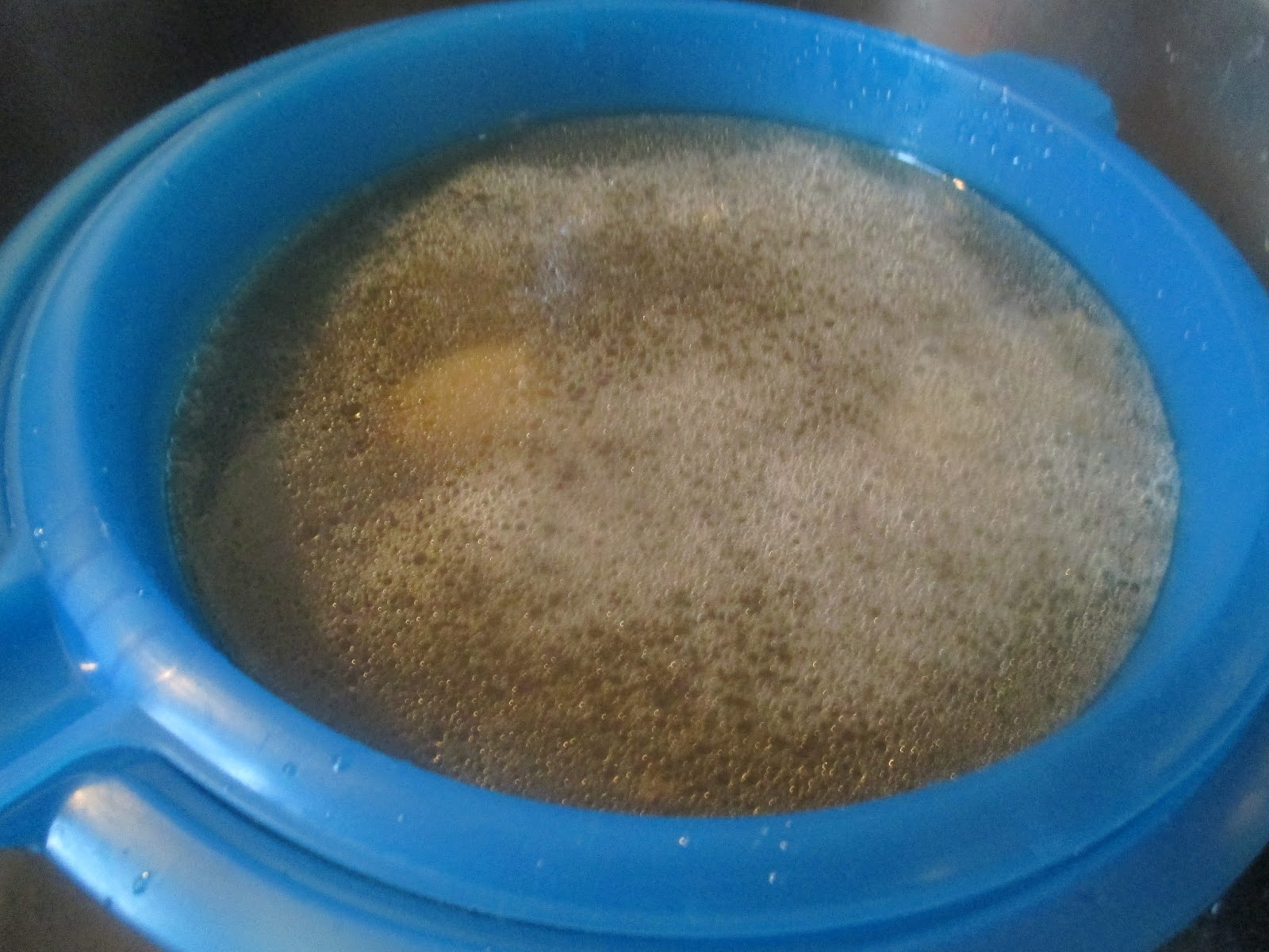 In der Zwischenzeit wird die Gelatine aufgelöst. Ich weiß, da schreien jetzt wieder alle rum. dass ja die Brühe (vielleicht) schon genug geliert, von den Knochen und den Pfoten und dem Schweinskopf, aber ich habe dem Frieden nicht so recht getraut, und bevor ich Euch kein fest gewordenes Sauerfleisch präsentiere, gehe ich lieber auf Nummer sicher.