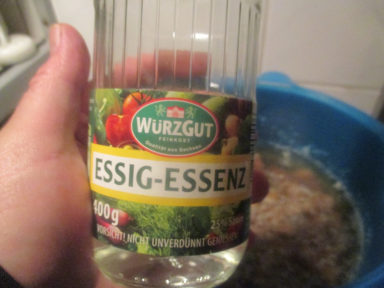 Essig-Essenz, oder Essig für die Säure dazu geben (nach Geschmack), aber eher mehr als weniger, schließlich soll es Sauerfleisch werden. Wacholderbeeren, Lorbeerblatt und Senfkörner dazu geben.