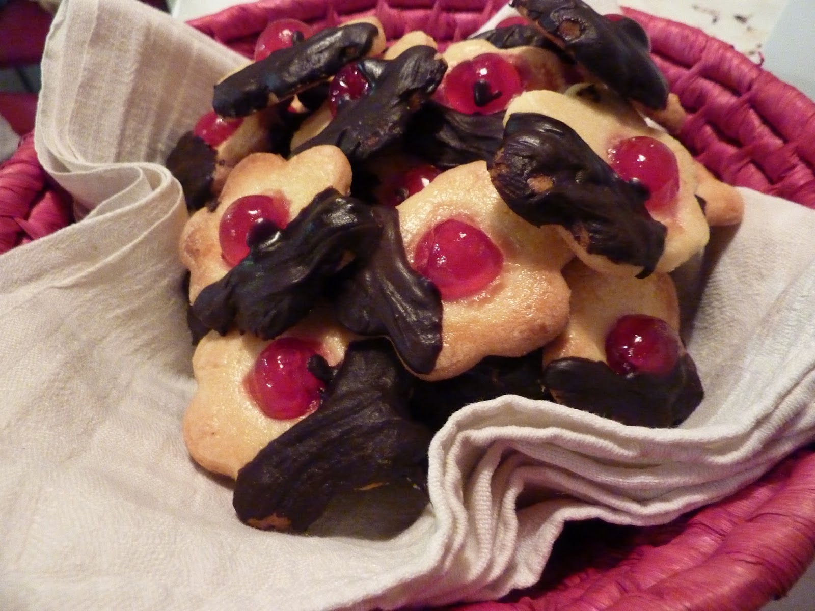 Hier die die fertigen Kirschrosetten, seit Ewigkeiten meine Lieblingskekse. Die sind einfach toll, mit der Kirsche, der Schokolade und dem knackigen Mürbeteig.