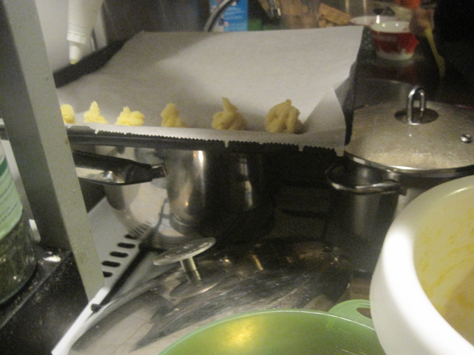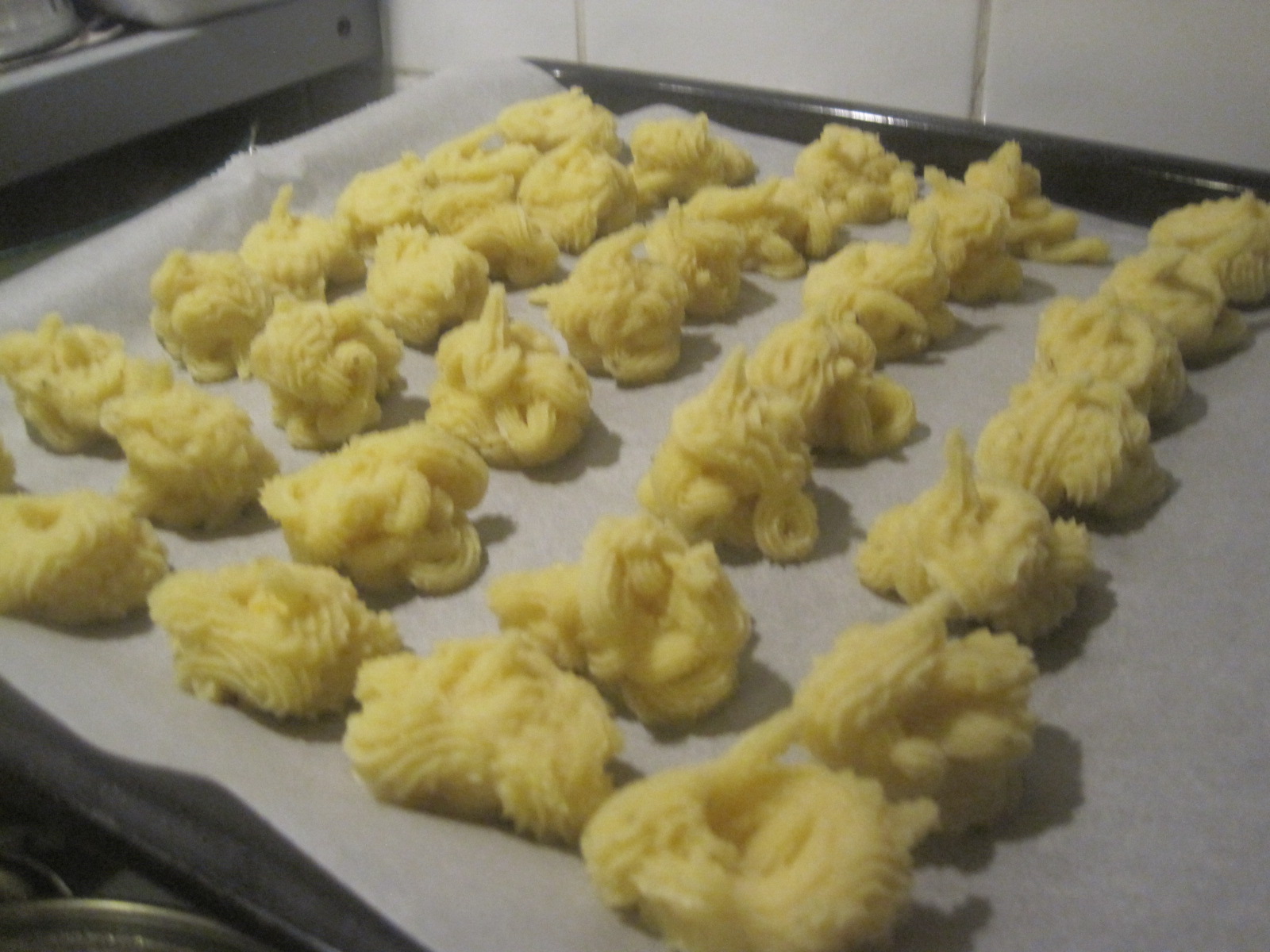 Jetzt im Nachhinein weiß ich das auch, dass man die Spritztüte einfach nur ansetzen und dann abdrücken und hochziehen muss. Ich habe irgendwie ein wenig unmotiviert rumgekringelt und war froh, dass die Tüte leer und das Blech voll wurde.