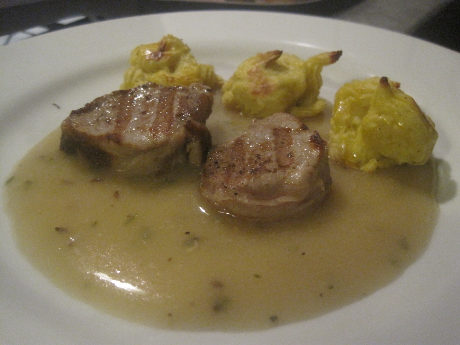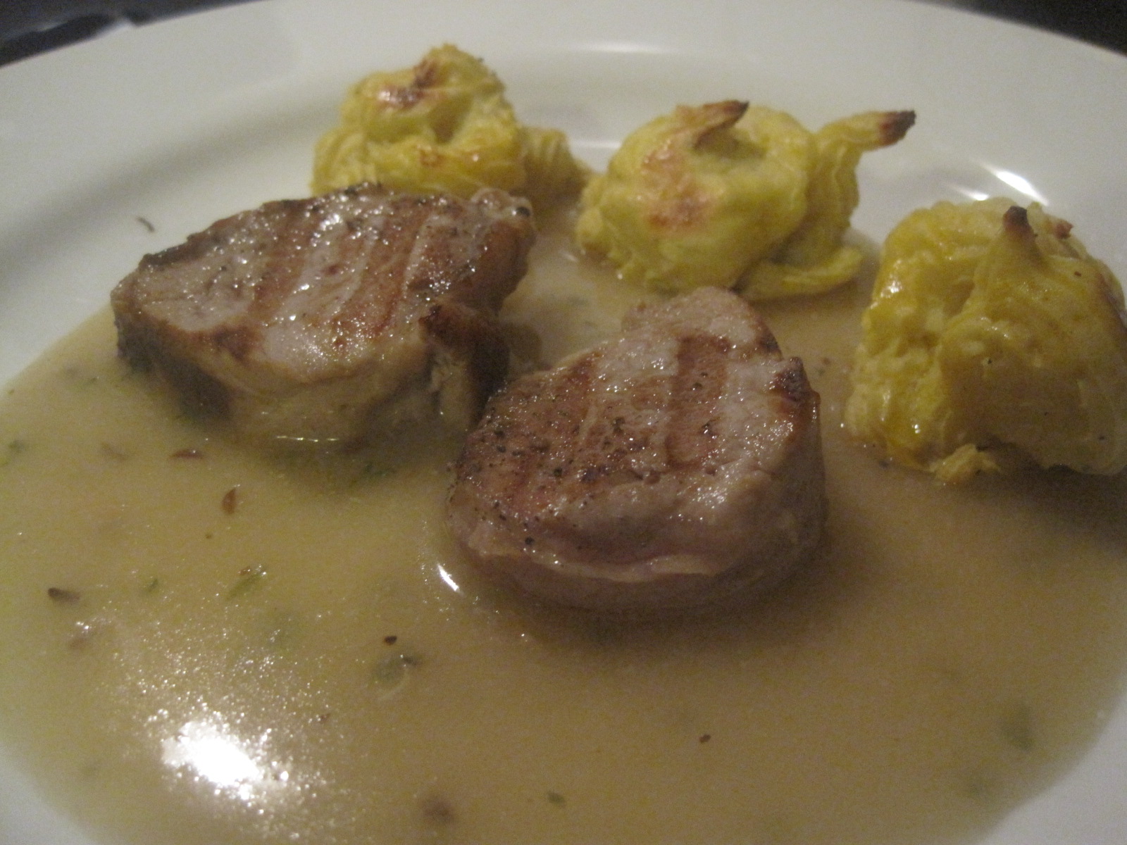 Hier sind die fertigen Pommes duchesse, mit Schweinefilet auf Wermutsoße (Rezept kommt).